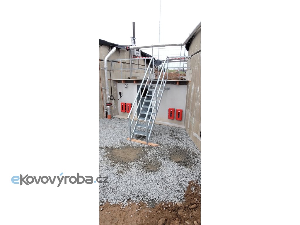 Profesionální venkovní schodiště s prostornou nástupní plošinou, vyrobené z žárově zinkované oceli pro maximální odolnost proti korozi.