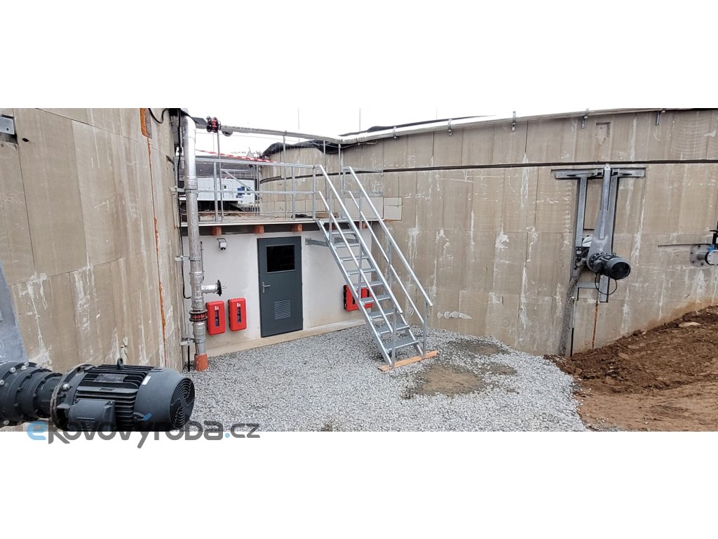 Konstrukce zahrnuje pevné protiskluzové stupně, pevné kotvení a celoplošné bezpečnostní zábradlí. Plošina usnadňuje bezpečný přístup.