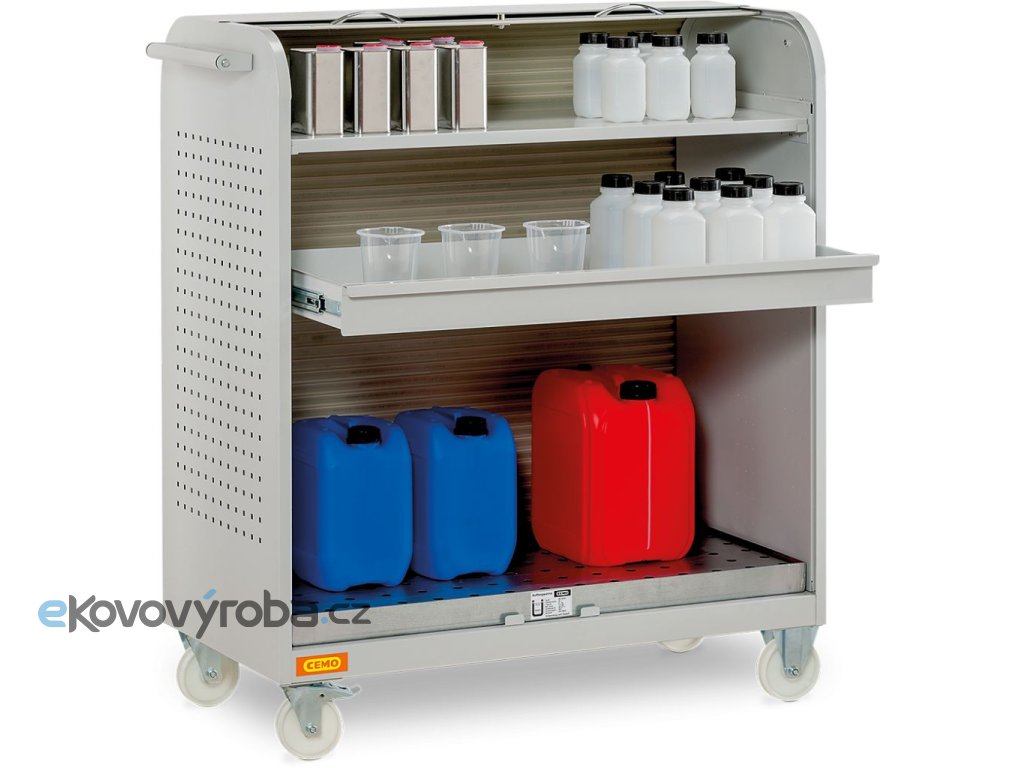 Kovový, zamykatelný vozík pro uskladnění nebezpečných látek. Vozík má dvě otočná a dvě pevná kola. Na dně skříně je záchytná vana s perforovaným roštem o objemu 33 litrů. Uvnitř skříně se dále nachází pevná polička pro drobné nádoby a výsuvná vanová police s nosností 50 kg.