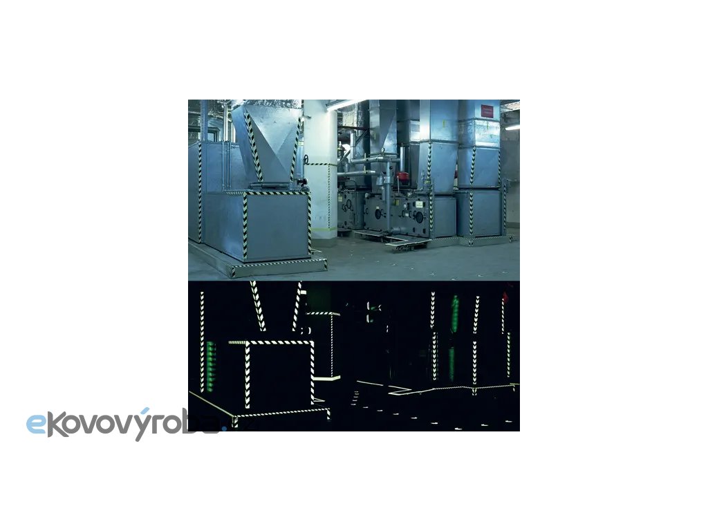 Páska je vyrobena ze samolepicí fólie. Výstražné barevné provedení fotoluminiscenční zelená / zelená upozorňuje na případnou překážku ve dne. Díky fotoluminiscenční vlastnosti materiálu značení vyzařuje světlo i při zhoršených světelných podmínkách. Umožňuje tak stále dobře vidět části strojů nebo označení únikových cest. |