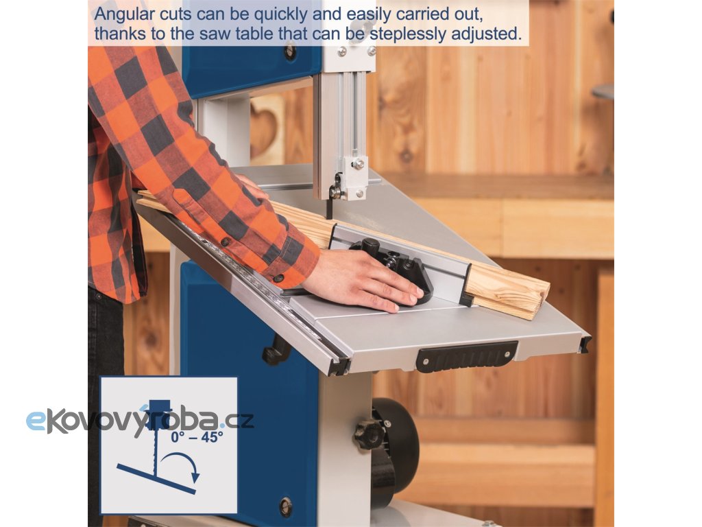 Dlouhé přímé řezy, oblouky, řezy pod úhlem, složené řezy, vše zvládá pila s přehledem. Díky nastavení rychlosti pásu a velmi silnému motoru, můžete pracovat s rozličnými materiály –měkké či tvrdé dřevo, polystyren, plast ap. Díky možnosti připojení odsávání se výrazně potlačí prašnost ve vaší dílně. Pro ještě příjemnější práci v ideální výšce je stroj standardně vybaven pevným ocelovým podstavcem. Dodává se s druhým náhradním pilovým pásem a úhelníkem pro řezání pod úhly.