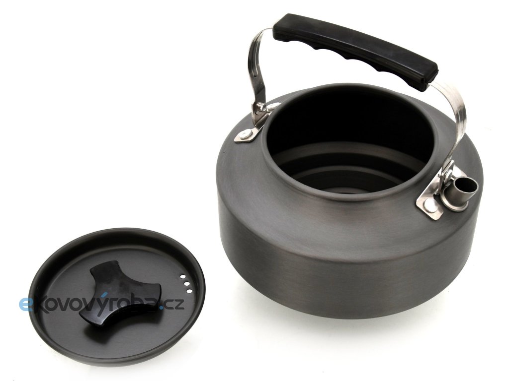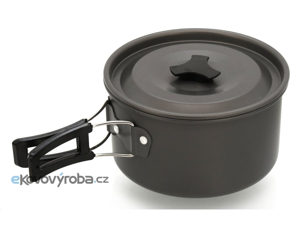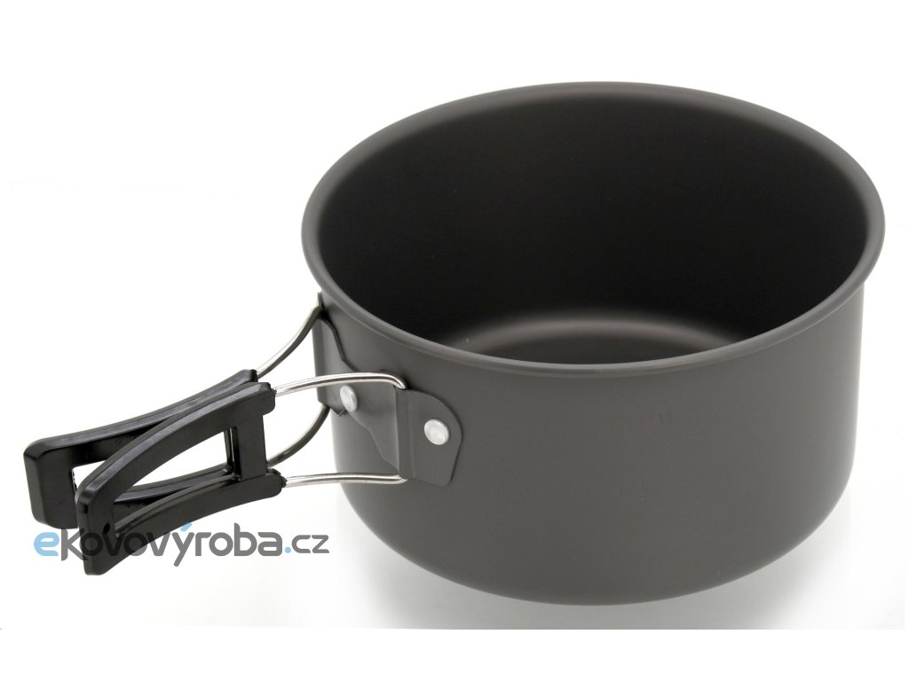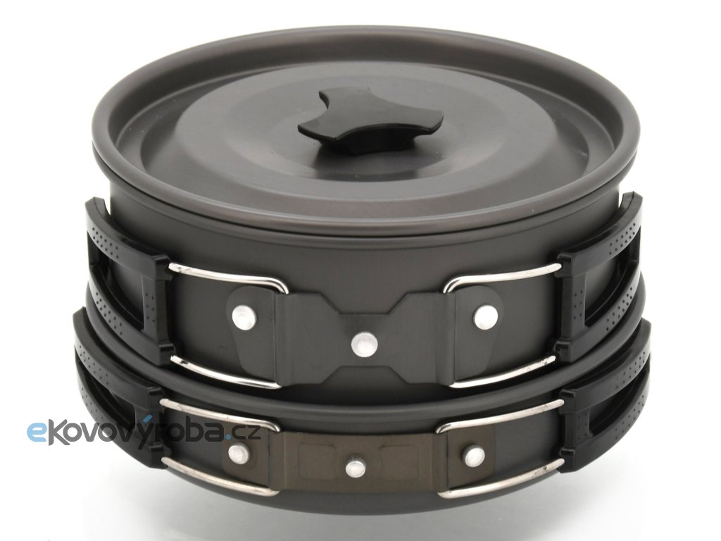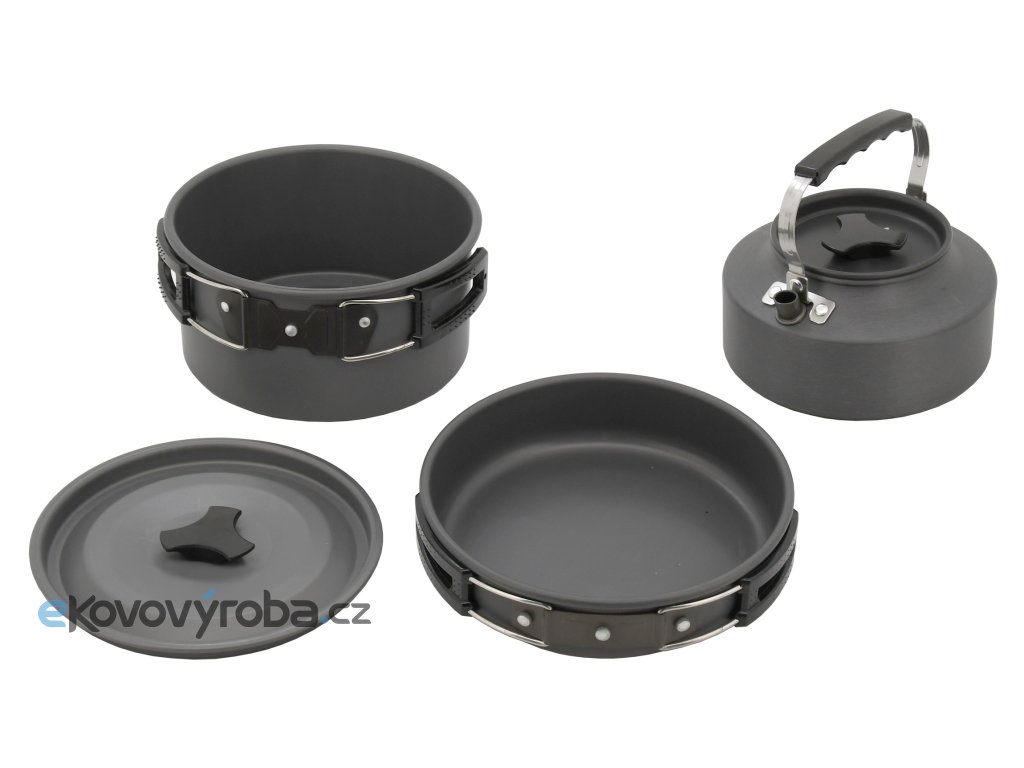 Tato sada z anodizovaného hliníku obsahuje pánvičku 18 x 4 cm, kotlík 17 x 9 cm, konvici 15 x 7,5 cm a víko o průměru 17 cm. Díky odstupňovaným velikostem se dá nádobí složit do sebe. Pro pohodlnou manipulaci jsou hrnce vybavené sklápěcími držáky se silikonovými návleky. Vše je navíc uložené v praktické sítěné tašce, takže se sada skvěle přenáší.