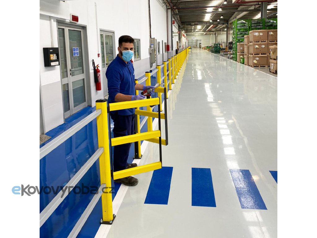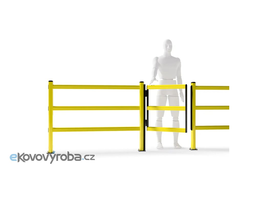 Dveře k modulovému zábradlí drží na pevných pantech na vnější straně sloupku. Panty jsou vybaveny pružinou pro samozavírání. Zábradlí je tvořeno pružnými příčnicemi a sloupky ve výrazné žluté barvě, která zvyšuje viditelnost této zábrany a upozorňuje na překážky. |