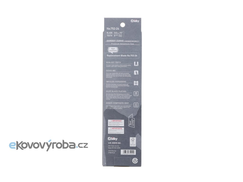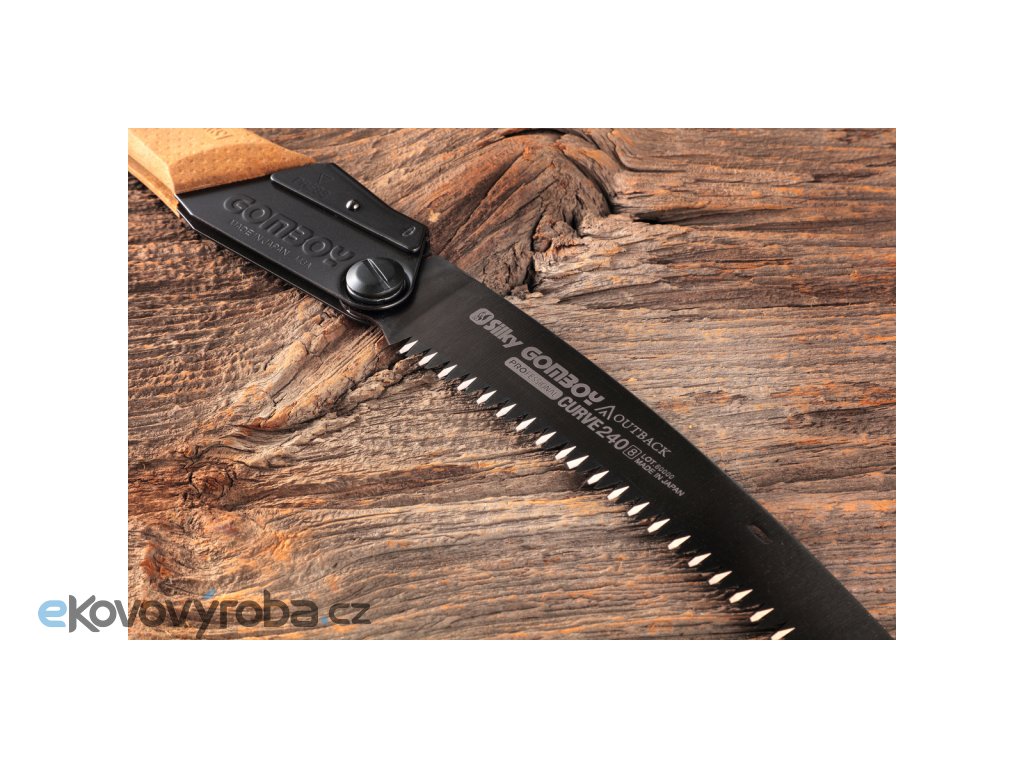 Pila je vybavena pevnou, extrémně silnou, zakřivenou čepelí o délce 24 cm s velkými zuby o počtu 8 zubů na 3 cm, které si snadno poradí s čerstvým i suchým dřevem. Zakřivení čepele o poloměru 650 mm celkově zvyšuje agresivitu, se kterou zuby prořezávají do materiálu, a navíc se tak s pilou dobře pracuje i v extrémnějších polohách. Čepel lze jednoduše složit a rozložit pomocí aretačního tlačítka, přičemž jsou dostupné dvě různé polohy řezání. Rukojeť má otvor, který usnadňuje připevnění lanka nebo karabiny a při složení dokonale chrání zuby, takže si pilu můžete bez obav sbalit do batohu.