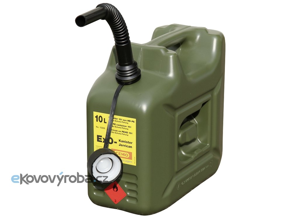 Ex0-kanystr 10 l v provedení pro potlačení výbuchu. Kanystr je vybaven nálevkou a bezpečnostním uzávěrem. Při proudění benzínu vzniká statický náboj a speciální výplň uvnitř kanystru zajišťuje jeho odvod a zvýšení ochrany obsluhy. Kanystr odpovídá rozměrům běžným kovovým kanystrům. Rozměry: 35 x 17 x 31 cm