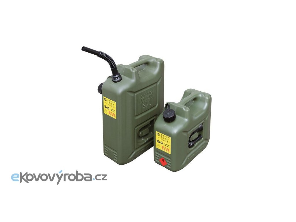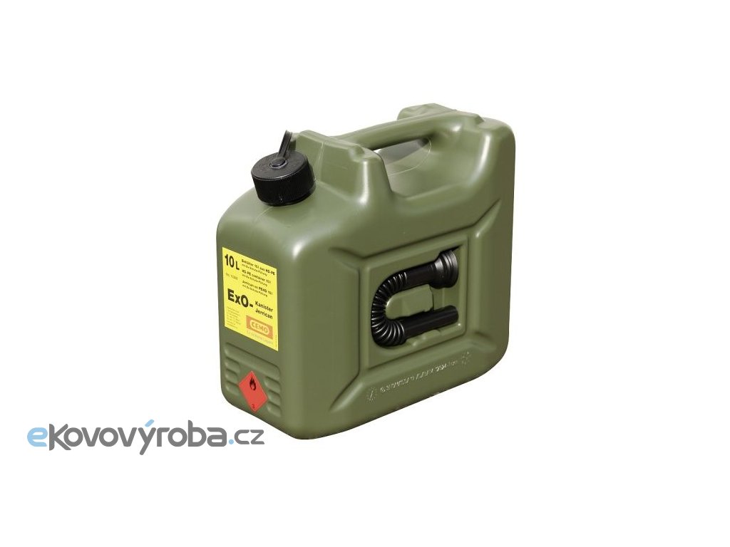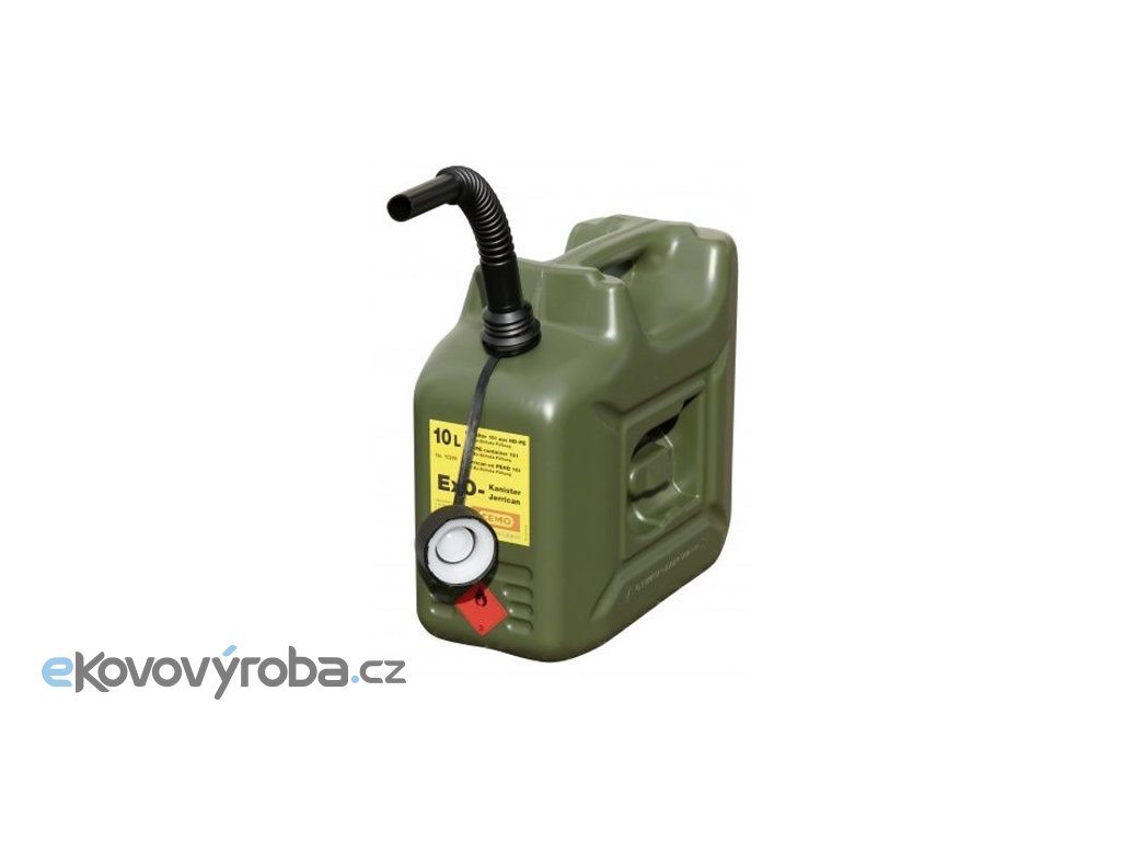 Polyetylenový kanystr o objemu 10 l s vojenským provedením. Vyrobeno z Polyetylenu s vysokou hustotou (HDPE). Kanystry jsou vhodné pro nebezpečné hořlaviny. Patentovaná ochrana pro použití ve výbušném prostředí. Splňuje nejvyšší nároky na bezpečnost. Vybaveno integrovanou výdejní hubicí a dětským pojistným uzávěrem. Kanystry jsou stohovatelné a pasují do obvyklých držáků na kanystry.