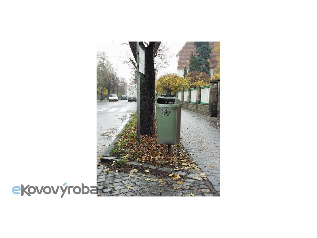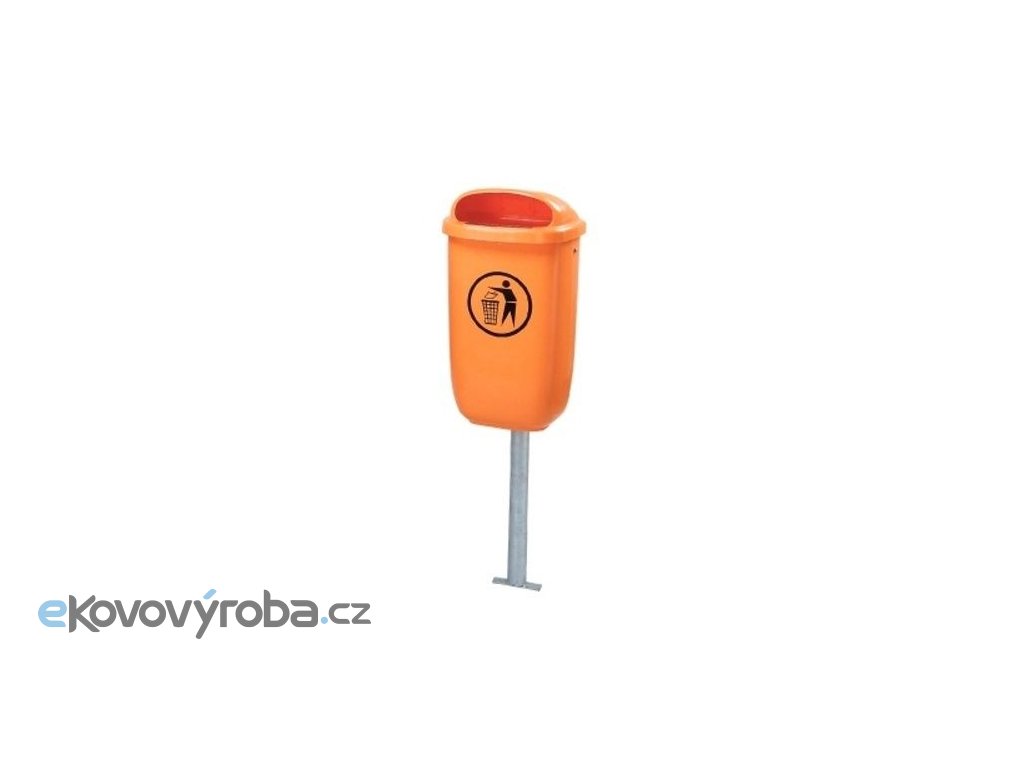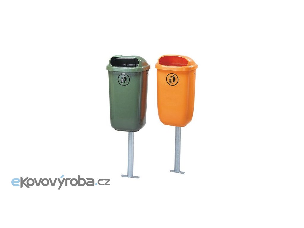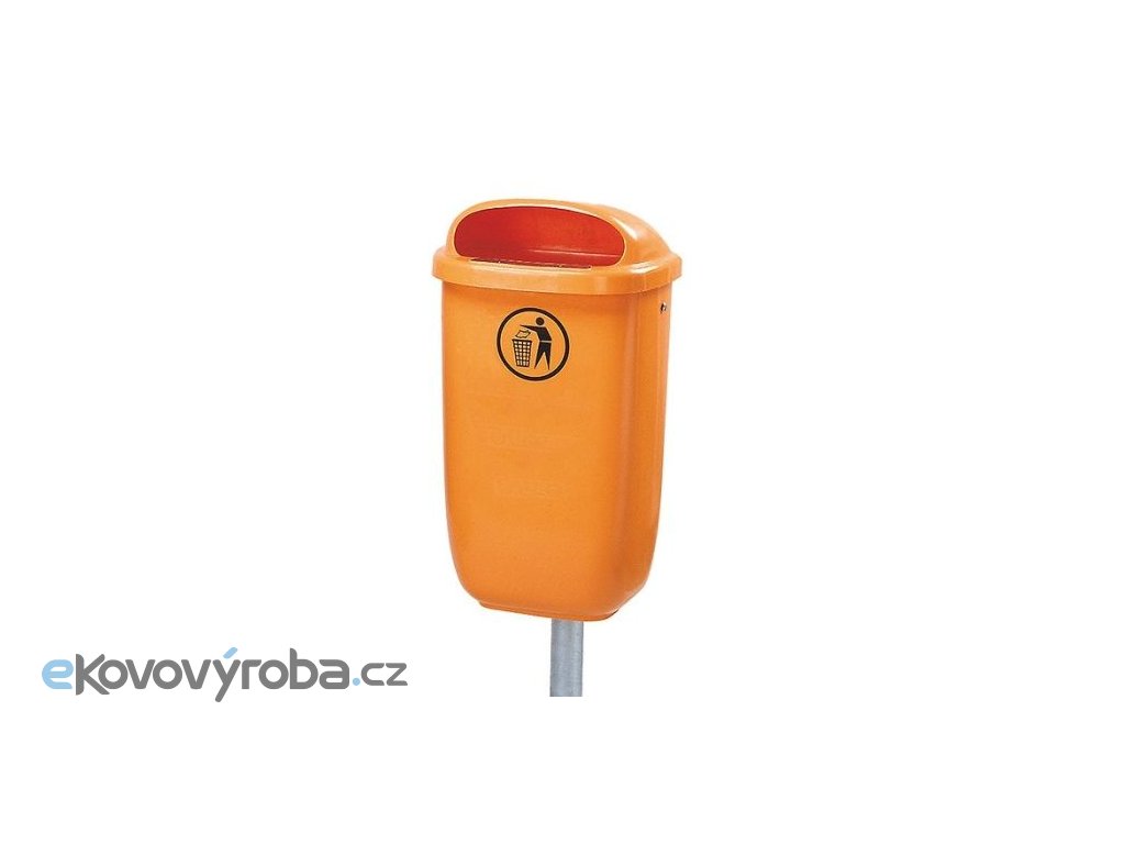 Plastový odpadkový koš o objemu 50 l vhodný pro fixaci na stojinu. Vyrobeno z plastu – Polyetylen s vysokou hustotou. Koš je odolný UV záření, mrazu a široké škále chemikálií. Kovové části jsou zinkované – odolné korozi. Koš je možné upevnit na stojan nebo stěnu. Vybaveno plechovým plátem pro hašení cigaret. Vybaveno univerzálním zámkem.