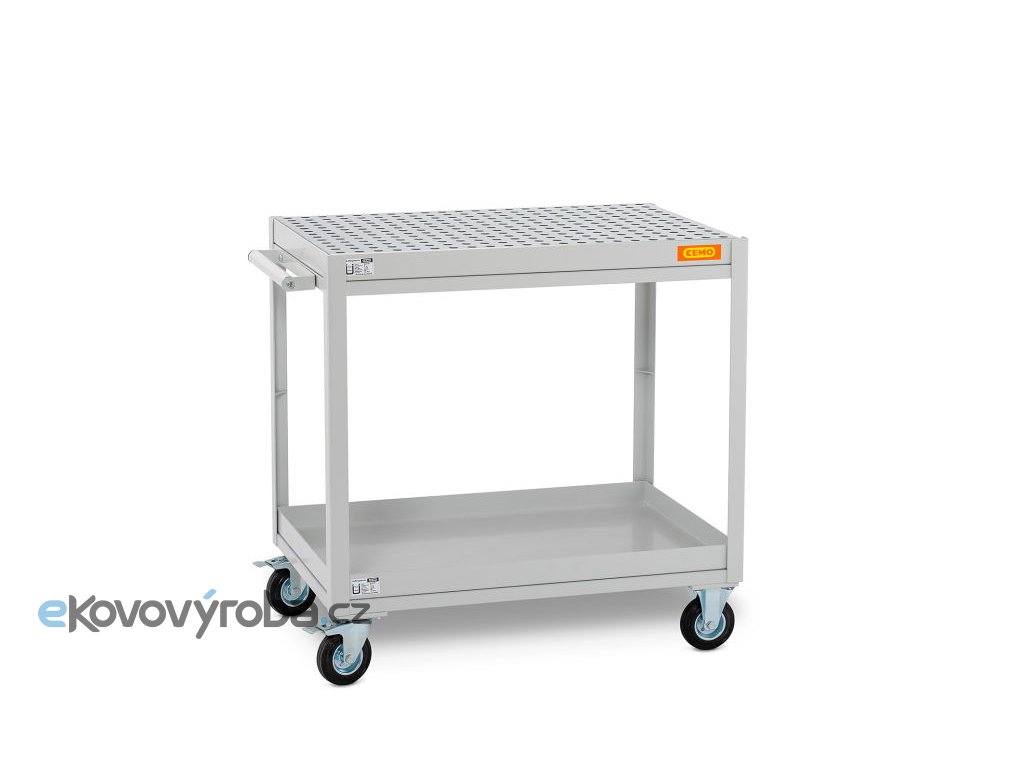 Ocelový vozík s dnem tvořeným záchytnou vanou o objemu 20 litrů a jednou policí o objemu 20 litrů včetně perforovaného roštu. Vozík je vybaven dvěma pevnými a dvěma otočnými koly a masivním madlem na boku vozíku. Rozměr vozíku je 99x61x92 cm