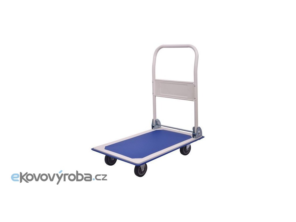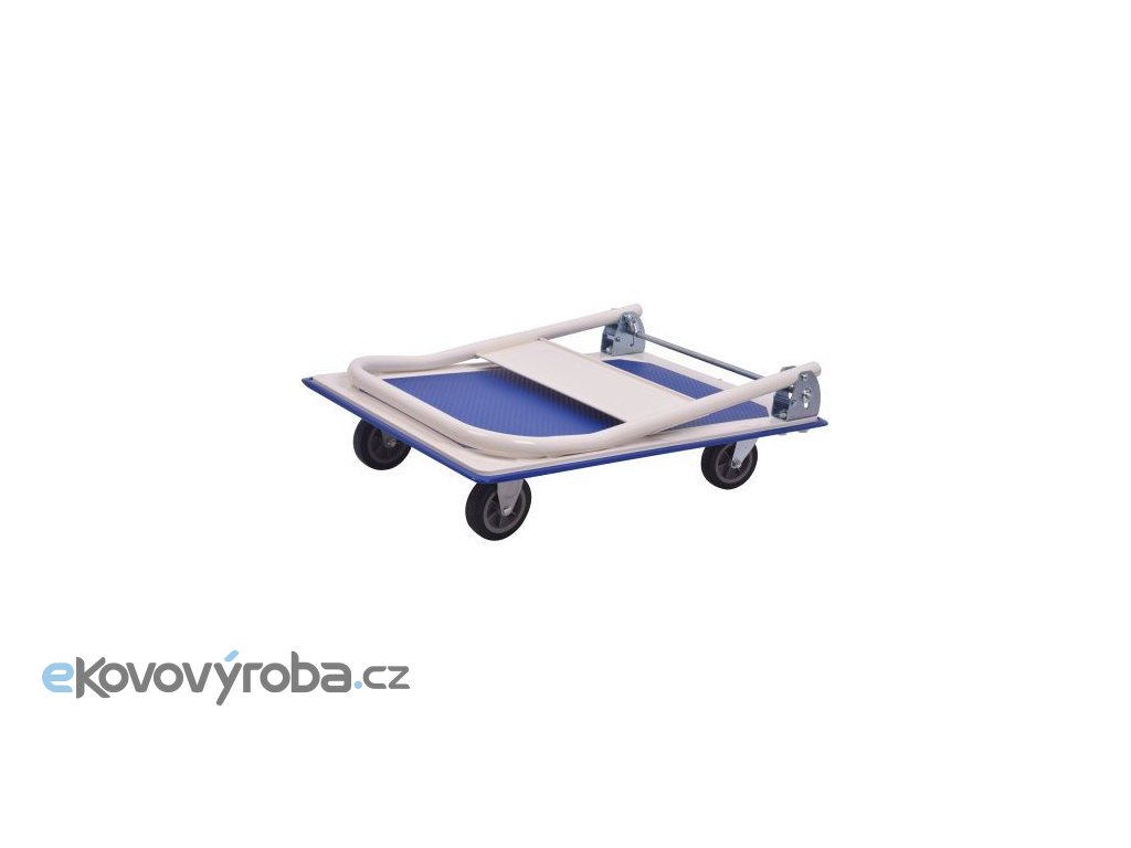 Transportní plošinový vozík k přepravě těžších břemen. Nosná plošina je pokryta protiskluzovým plastem a lemovaná plastovou lištou. Nízká hmotnost a vysoká nosnost. Madlo je sklopné – možnost snadného uložení vozíku. Vybaveno čtyřmi kolečky – 2x pevné a 2x otočné bez brzdy.