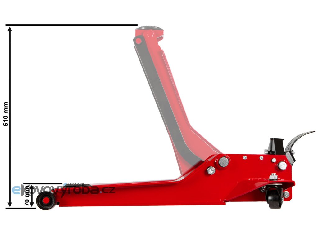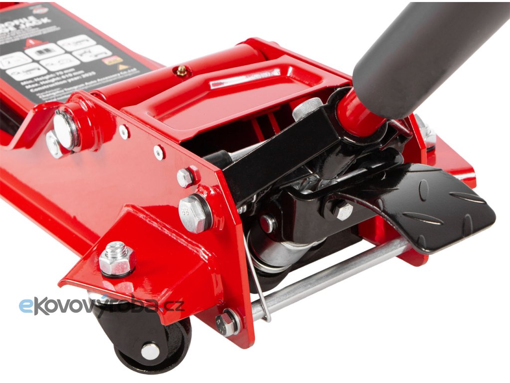 Vybaven jedním hydraulickým pístem s prachovými kryty, bezpečnostním ventilem proti přetížení a pojízdnými koly pro snadné umístění pod vozidlo.