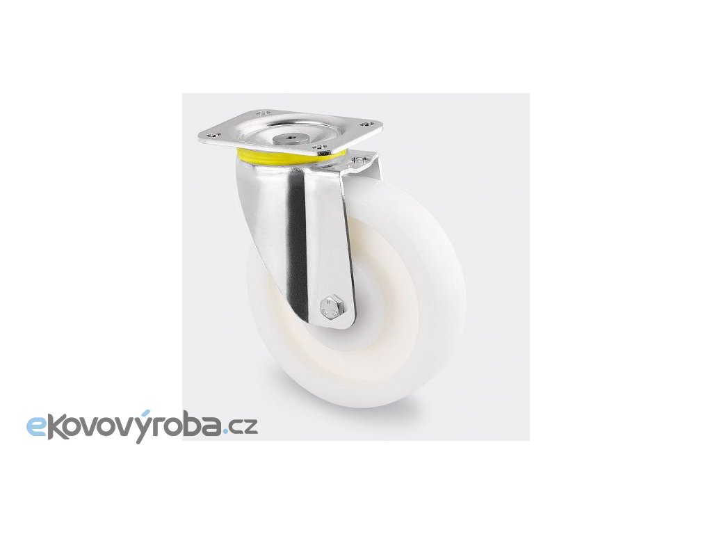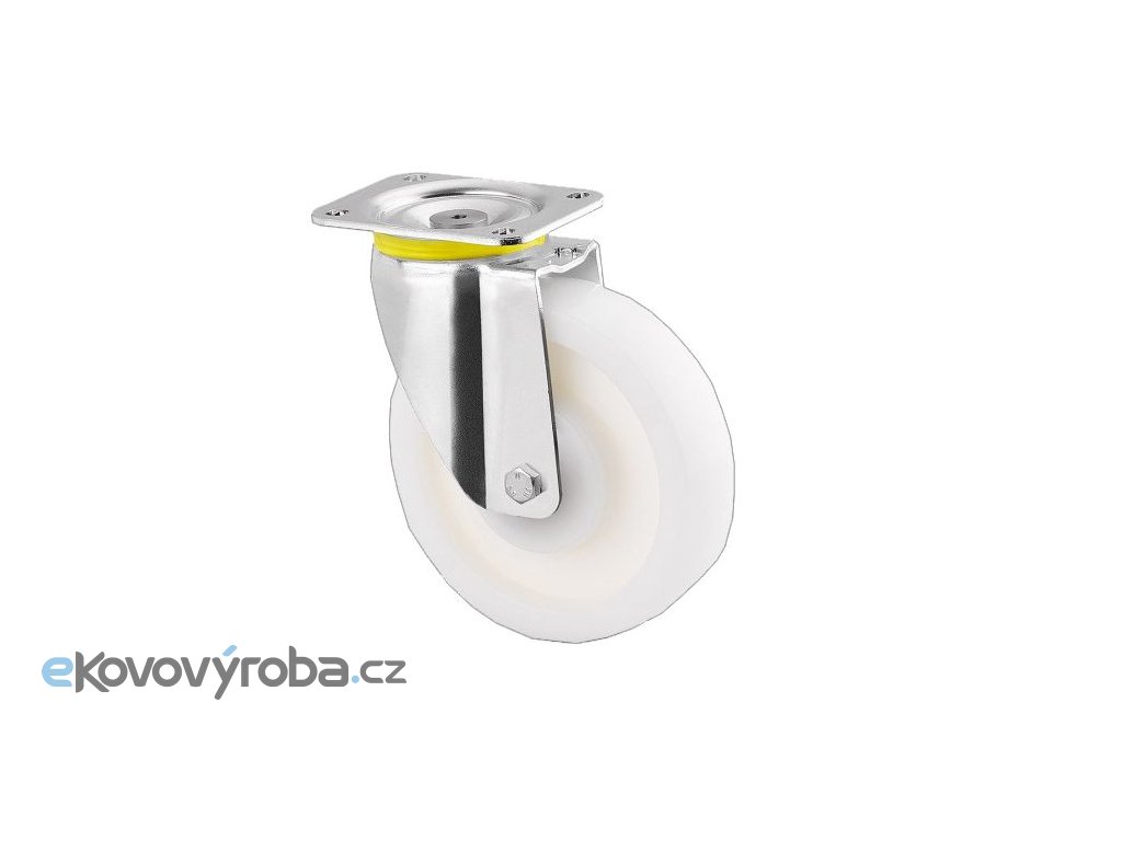 Vyrobeno z ocelového pozinkovaného výlisku – vidlice. Kolečko vyrobeno z polyamidu. Zpevněná ocelová vidlice v zinkované povrchové úpravě. Široké uplatnění kol u velké škály přístrojů, u kterých je zapotřebí zajistit mobilitu (pouze hladké a pevné povrchy). V souladu s normou EN 12532 – Kladky a kola pro rychlost do 4 km/h. - Polyamidové kolo s kluzným uložením. - Vhodná především pro potravinářský průmysl. 200 mm 46 mm 600 kg 240 mm 105x80 mm 137x105 mm 11 mm