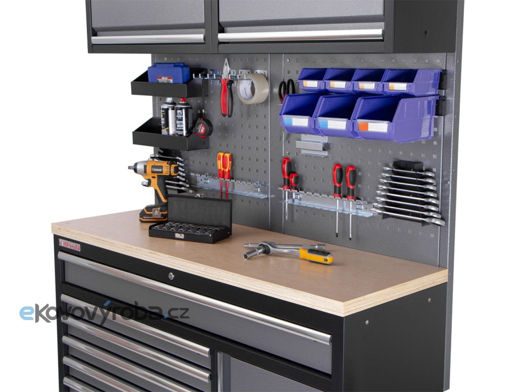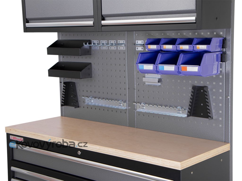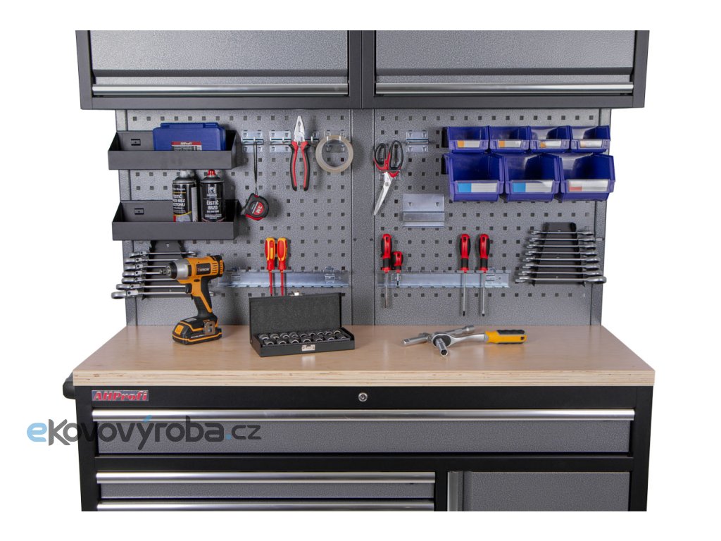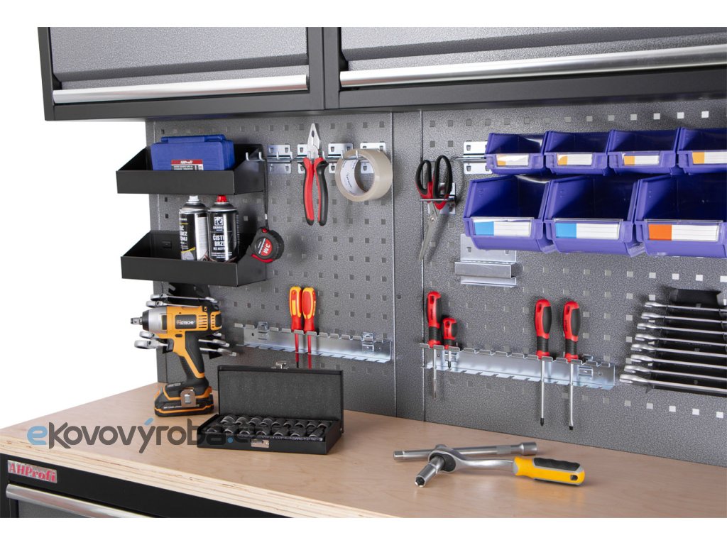 Příslušenství k děrované desce: 2 plechové závěsné misky (police na spreje), 2 držáky klíčů, 7 plastových organizérů (4 menší + 3 větší), 6x kovový dvojháček, (dvojitý hák), 2 držáky šroubováků, 1 stojan na vrtáky.