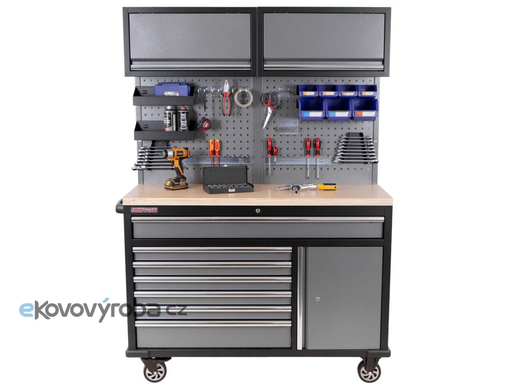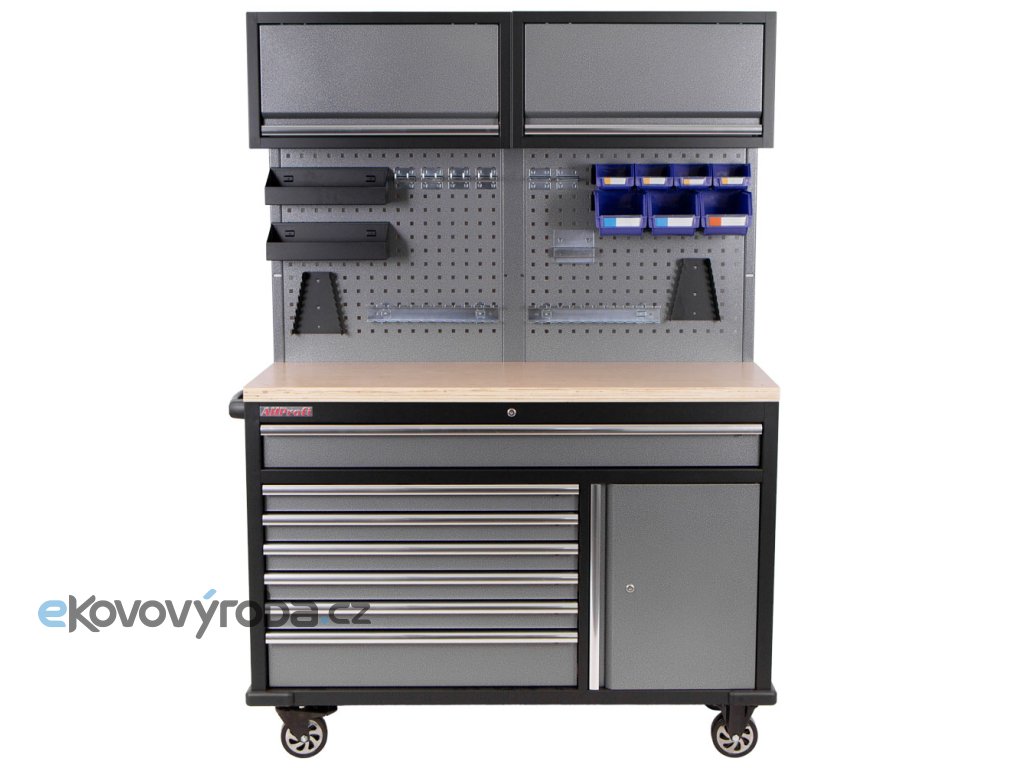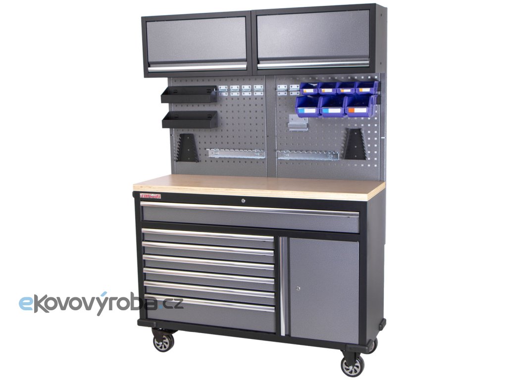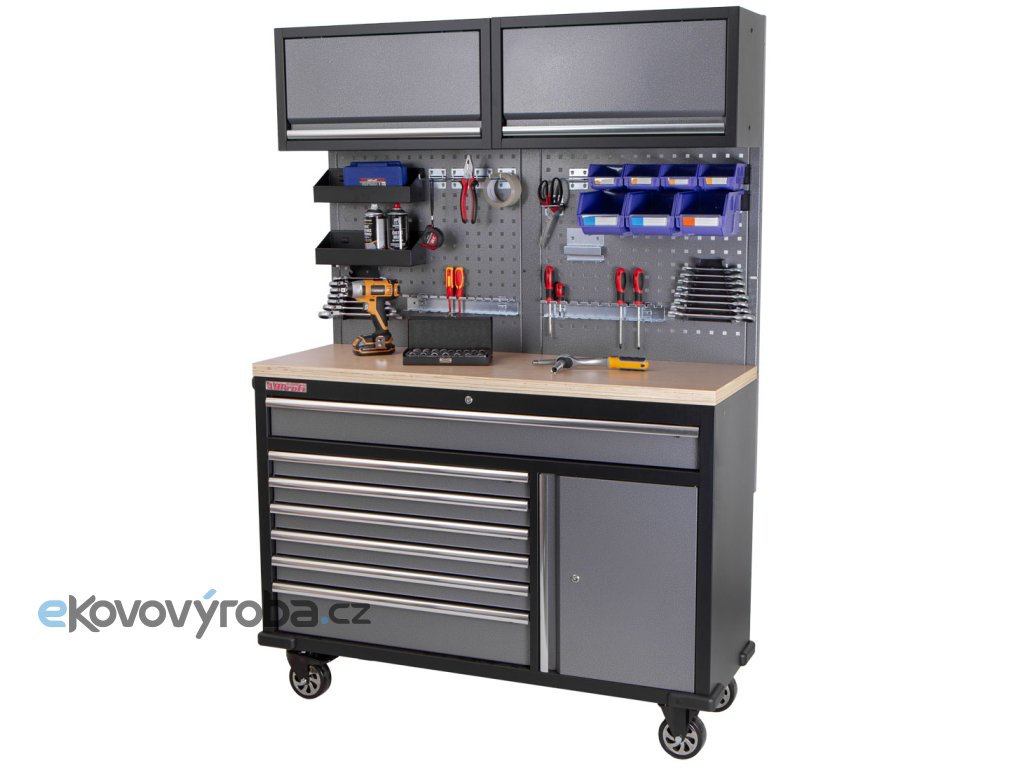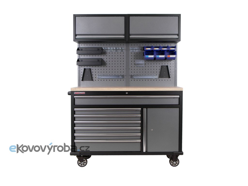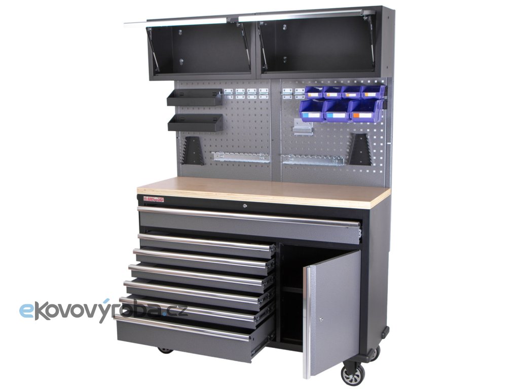 Dílenský vozík PROFI s dřevěnou pracovní deskou a horními skříňkami, 7 zásuvek