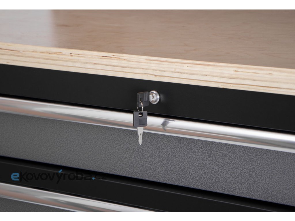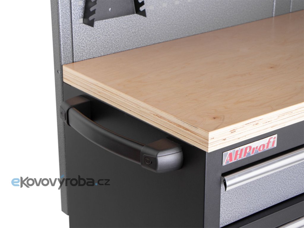 Dílenský vozík z řady nábytku PROFI GREY kombinuje pracovní plochu z odolného dřeva o rozměrech 1360 x 465 x 35 mm s bohatým úložným prostorem, který zahrnuje 2 horní skříňky, 7 zásuvek a 1 spodní skříňku.