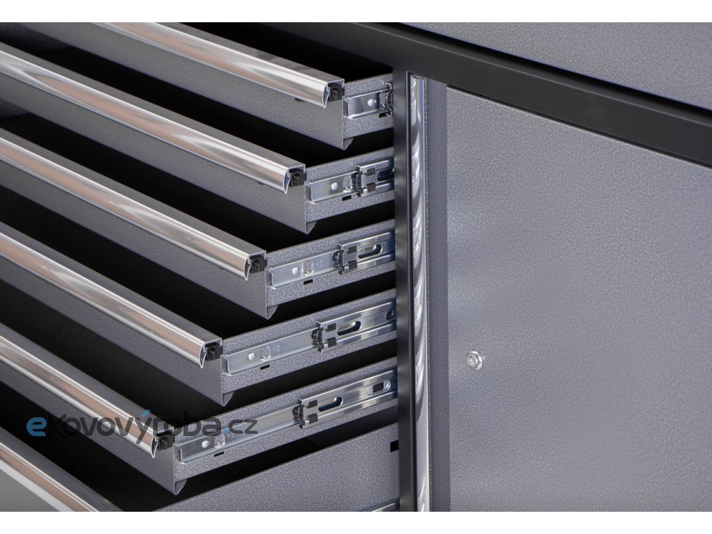 Zásuvky dílenského nábytku PROFI mají vysoce kvalitní pojezdy s kuličkovými ložisky, které poskytují plynulost a přesnost pojezdu zásuvek i při plném zatížení. Max. nosnost zásuvky činí 30 kg.