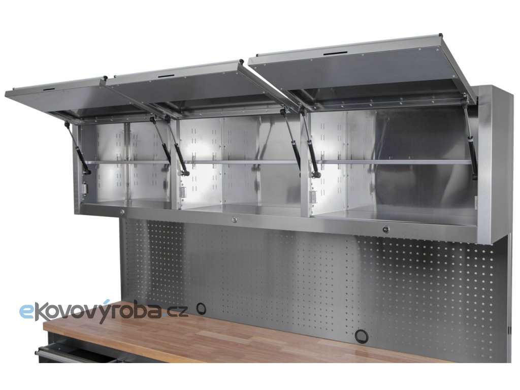 - 3 velké závěsné horní skříňky z nerezové oceli pro další úložný prostor.