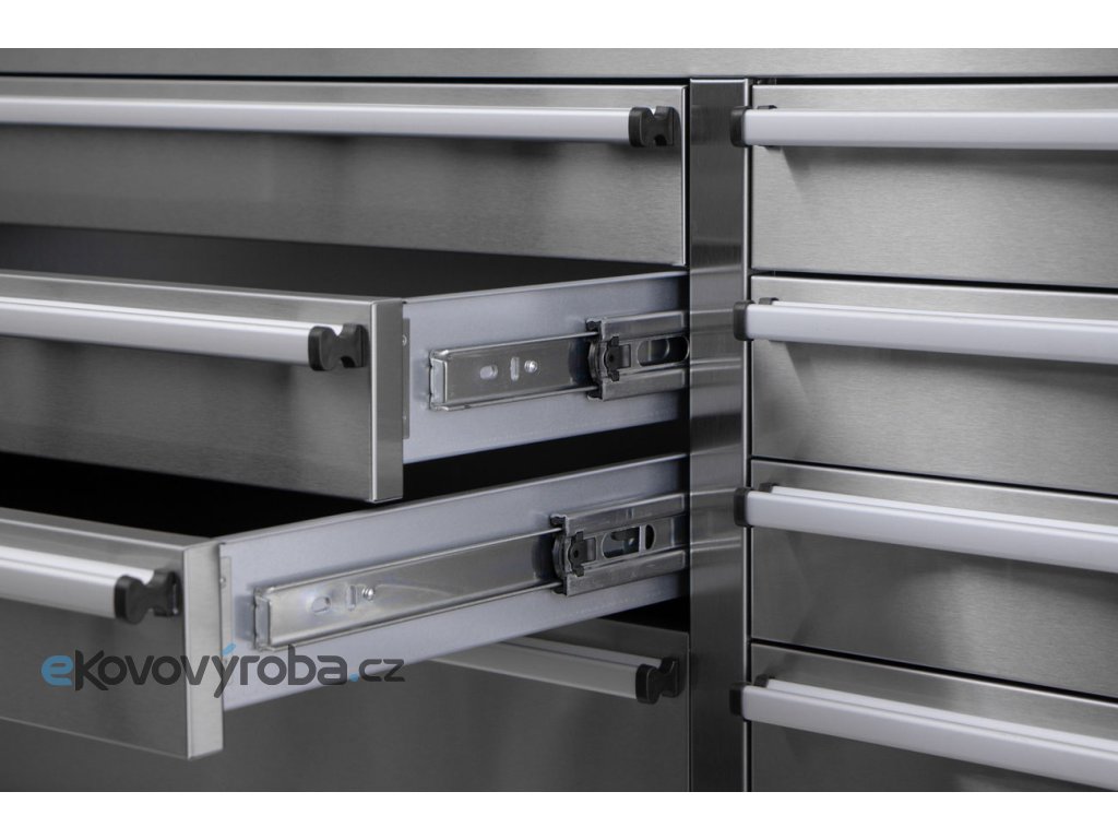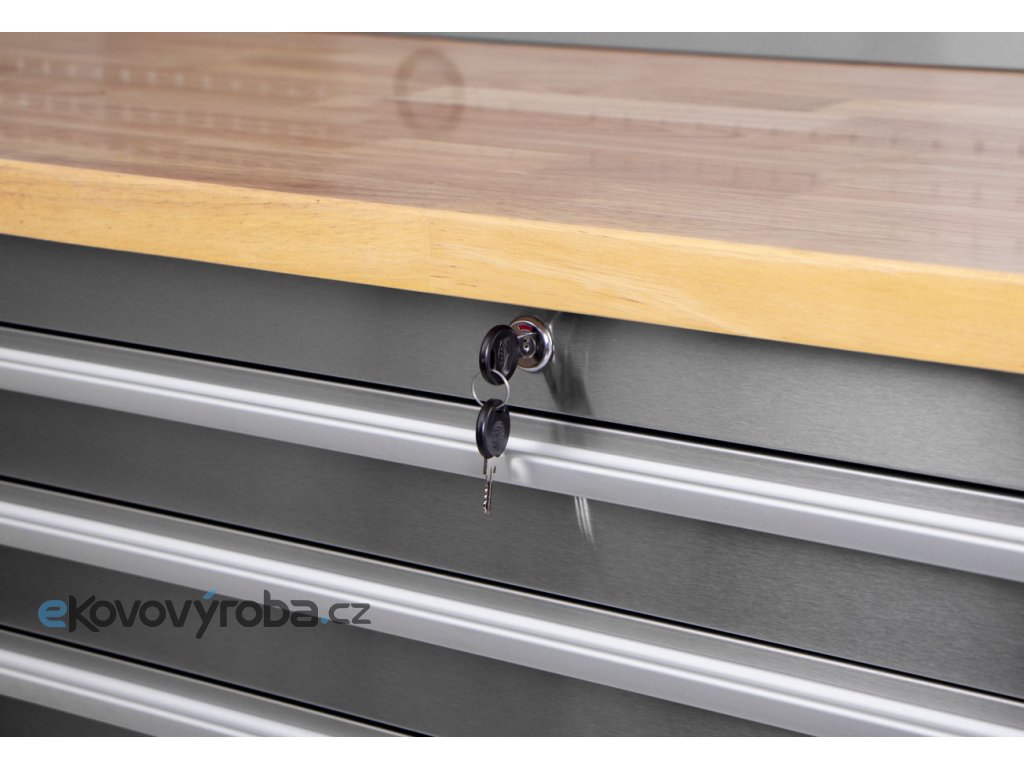 Tento model nabízí nejen velkorysý prostor na nářadí, ale také praktickou pracovní plochu, děrovanou desku a 3 závěsné skříňky a 15 zásuvek.