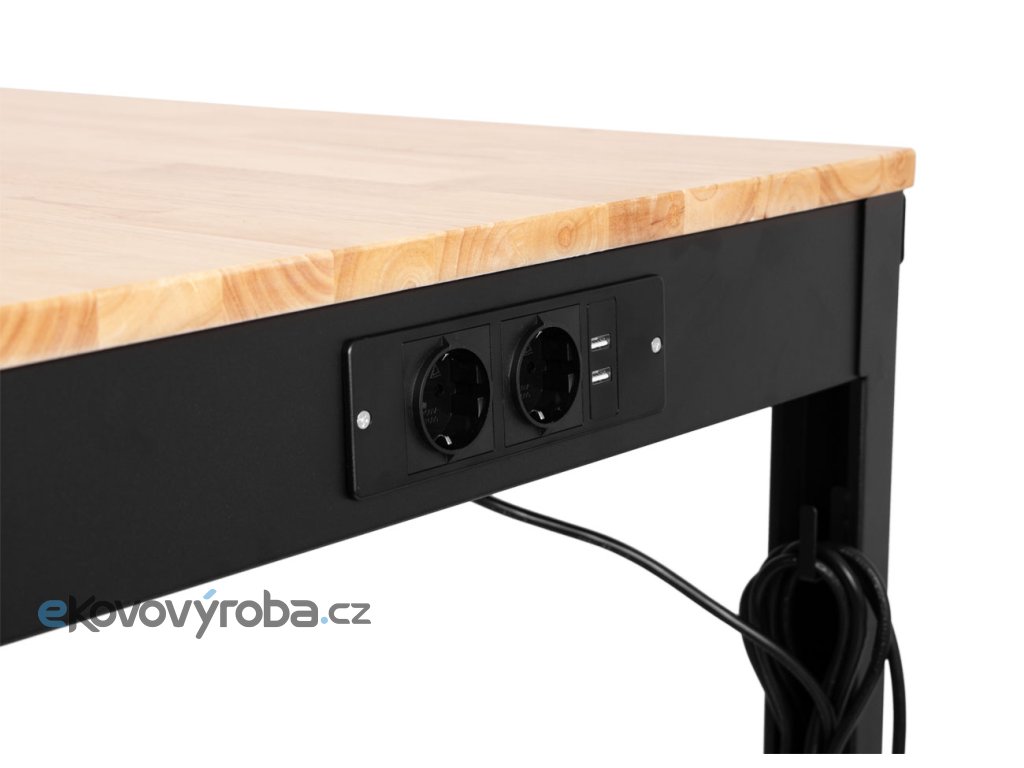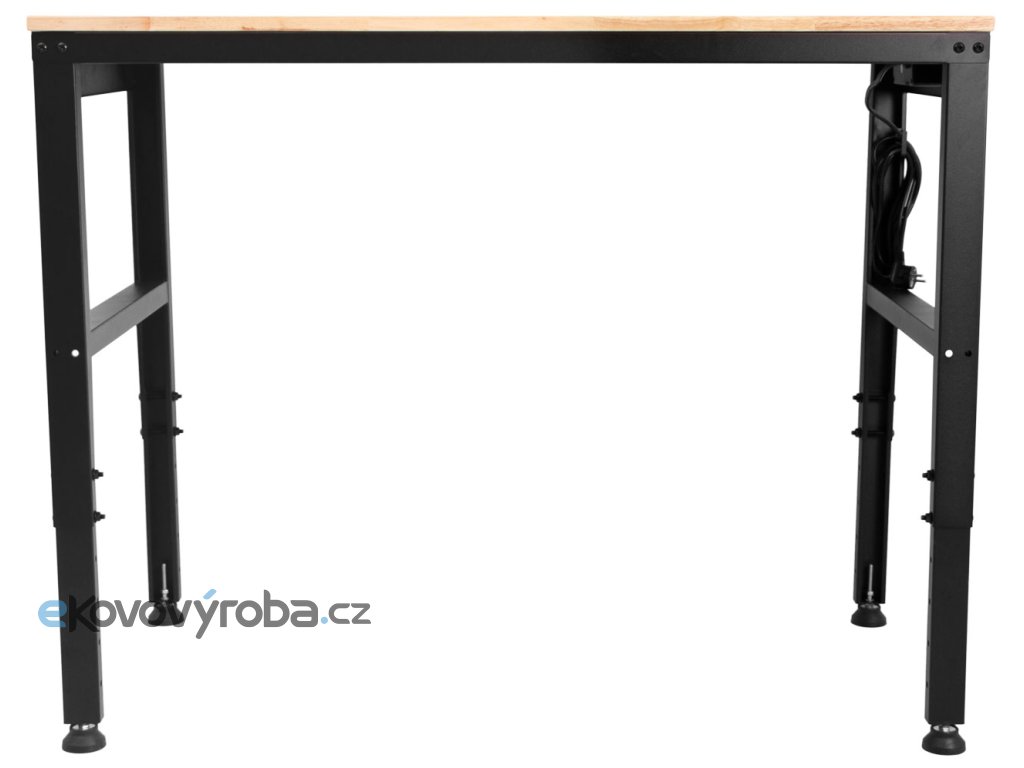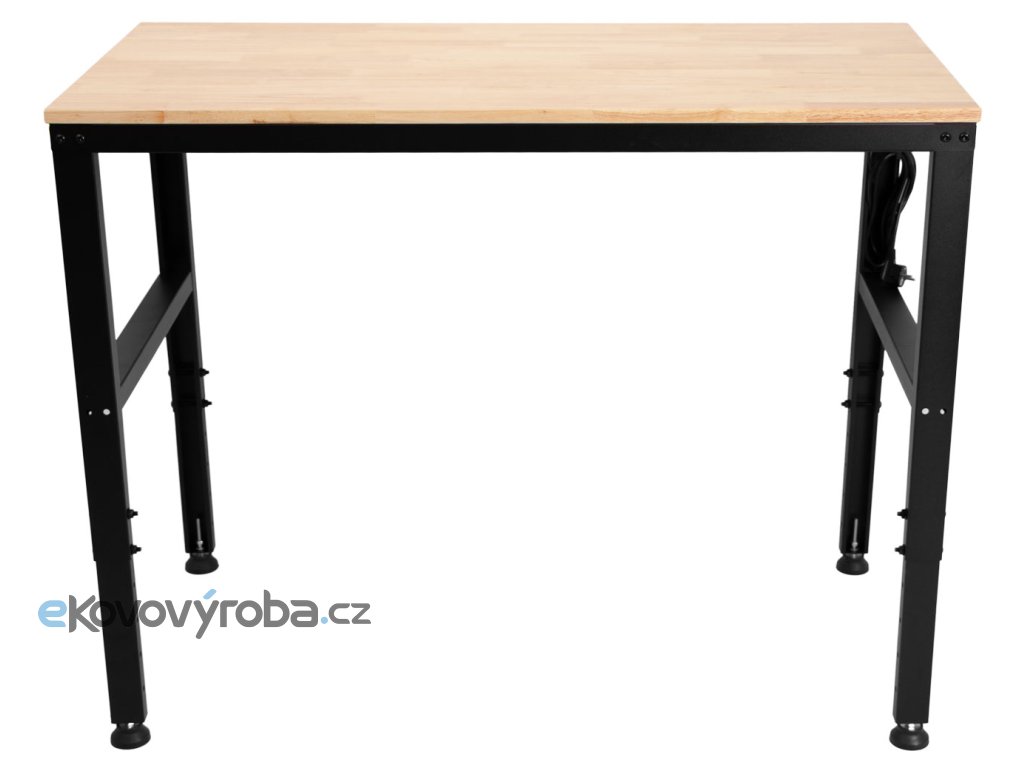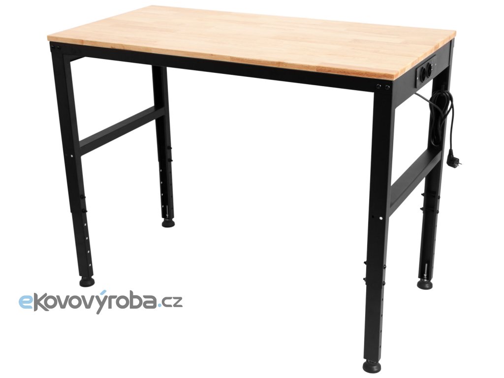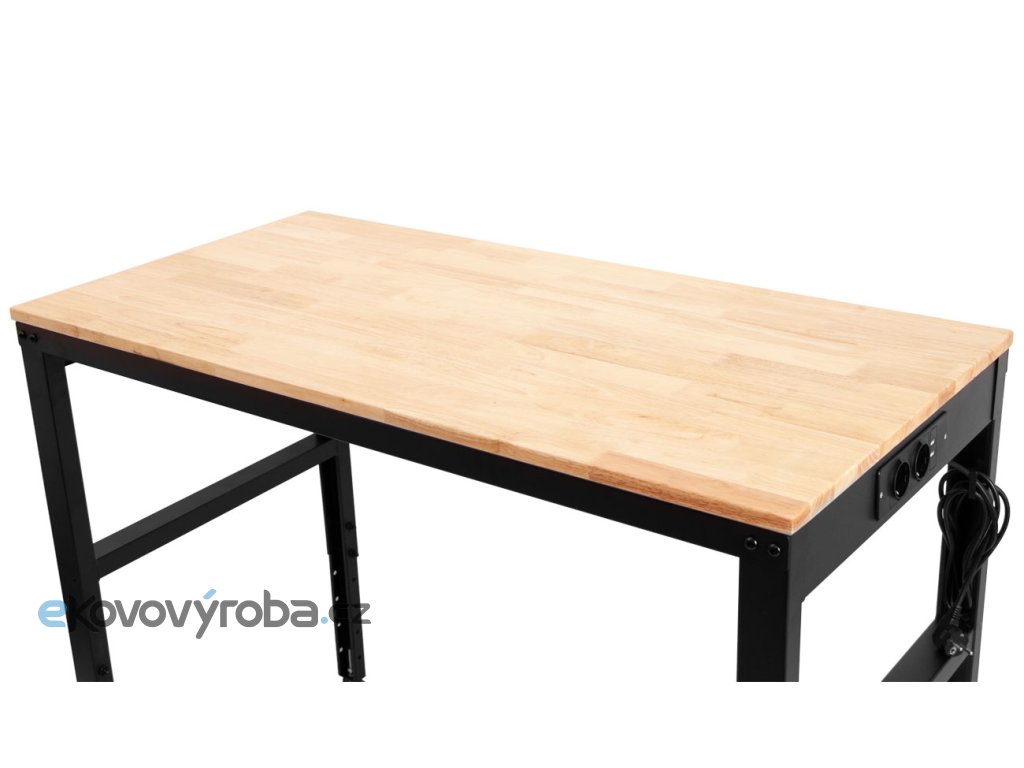 Výškově nastavitelný dílenský stůl s dřevěnou pracovní deskou a zásuvkami na 230V