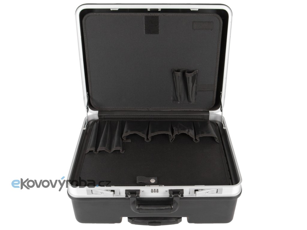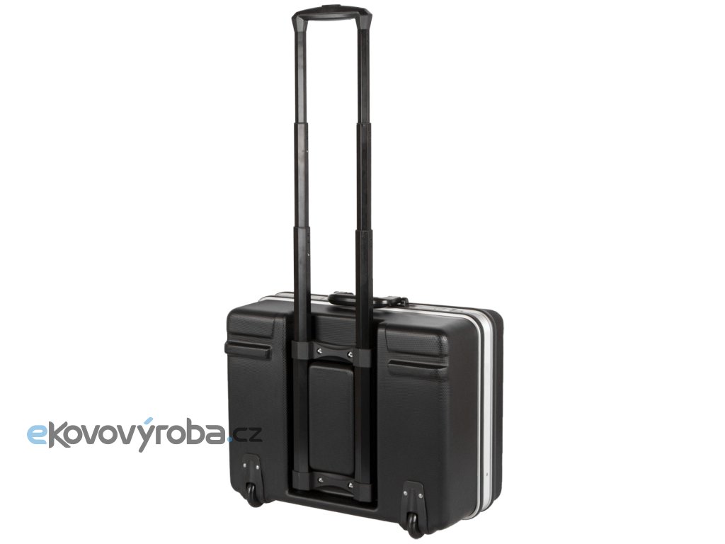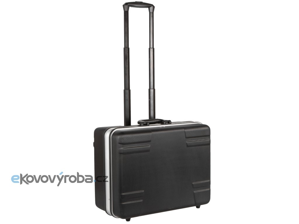 Kufr na nářadí o rozměrech (š x h x v): 500 x 400 x 255 mm. Kufr je lehce přenosný díky kolečkům a teleskopickému madlu.