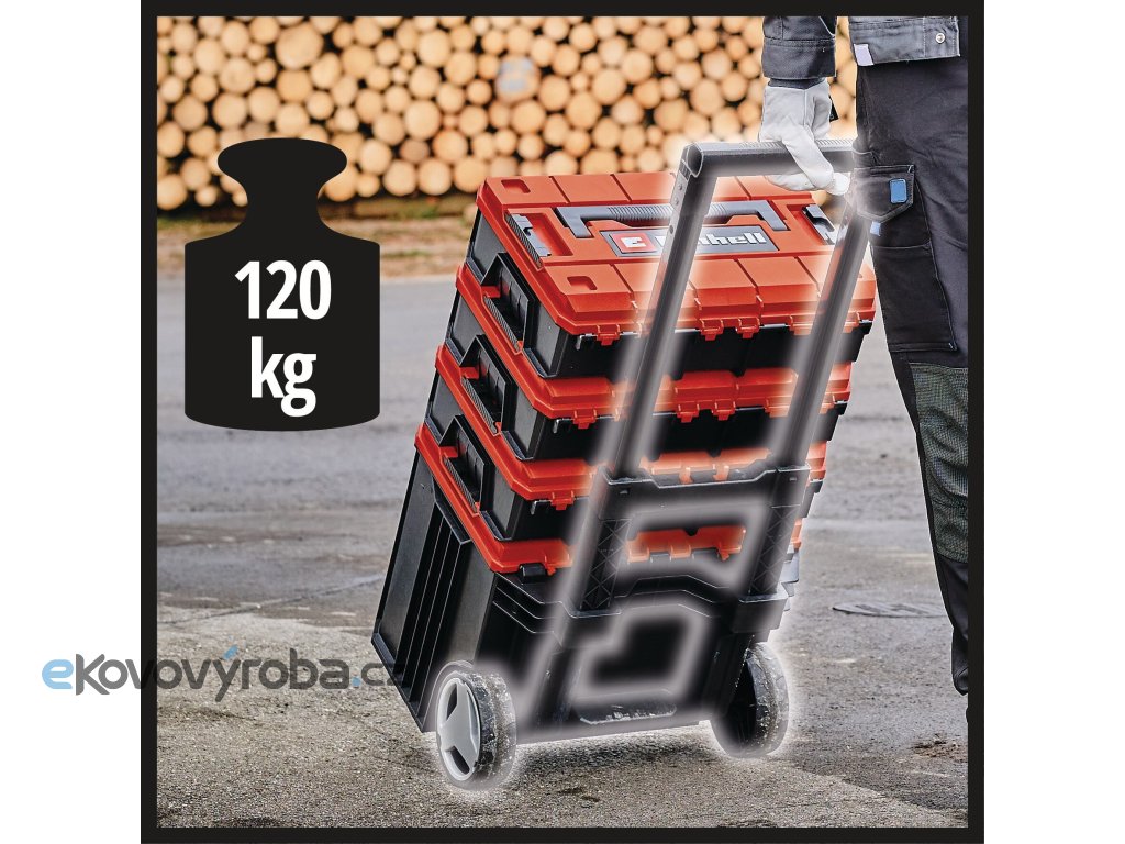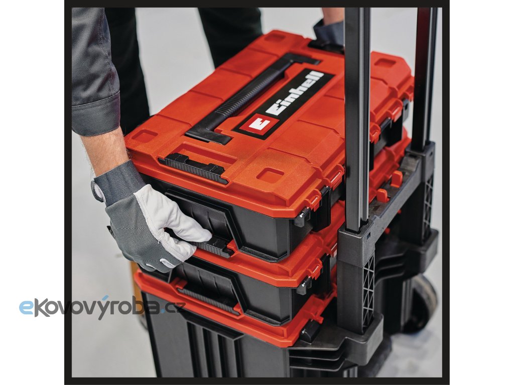 Einhell E-Case L je součástí modulárního systému E-Case od společnosti Einhell. Ten je určen pro skladování a přepravu strojů a nářadí. Praktický uzamykací systém pro spojování na sebe naskládaných kufrů zajišťuje systematický a bezpečný pořádek při přepravě. Kufr je vyroben z polypropylenu, a proto má vysokou tuhost, tepelnou odolnost a nárazuvzdornost. Stabilní konstrukce umožňuje celkové užitné zatížení až 120 kg. Stroje a nářadí lze snadno přepravovat díky teleskopické a mimořádně široké rukojeti. Velká kola zajišťují příjemné jízdní vlastnosti na jakémkoli povrchu. Díky inteligentní konstrukci je kufr odolný proti zatečení vody a lze jej přepravovat za každého počasí. Výsuvná a ergonomická rukojeť zajišťuje optimální pohodlí při přenášení, například při vyndávání kufru z kufru auta. Kufr E-Case L lze vybavit visacím zámkem, aby byl zabezpečen proti krádeži. Součástí je také vyjímatelná přihrádka na ruční nářadí a včetně popisovatelných samolepek pro identifikaci obsahu.