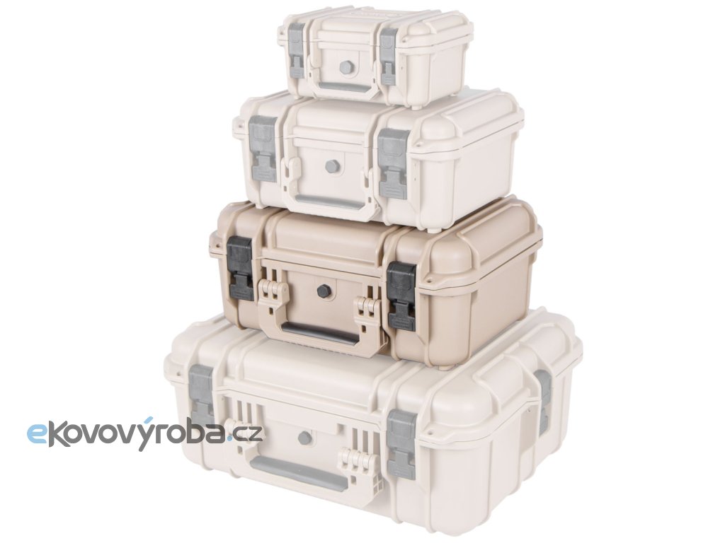 Vodotěsný plastový kufr v pískové barvě, pro různé druhy křehkého nářadí a vybavení.