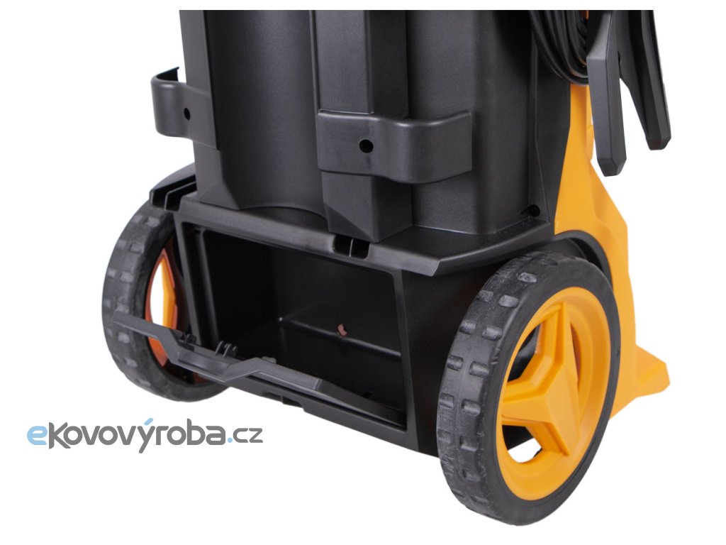 Vybavení zahrnuje: rychlospojku na pistoli i hadici, praktická transportní kolečka, teleskopické madlo, 10metrovou vysokotlakou hadici, přívodní kabel 5 m, kovové trysky, pěnovač a filtr na vstupu vody.