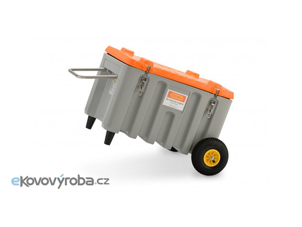 CEMbox vozík 150 l, šedo oranžový s nafukovacími koly a madlem. Vozík je určen k uskladnění nářadí nebo jiných věcí pro snadné uschování nebo manipulaci na stavbě, v lese nebo na poli. Vnější rozměry: 88 x 73 x 61 cm, nosnost 60 kg