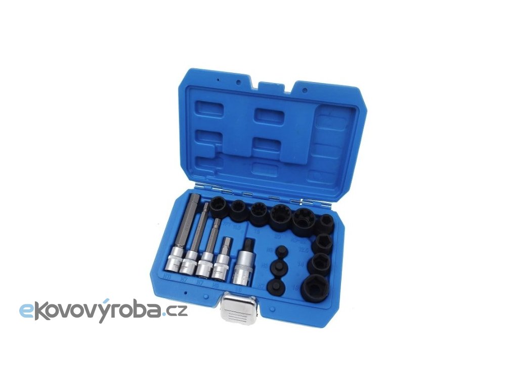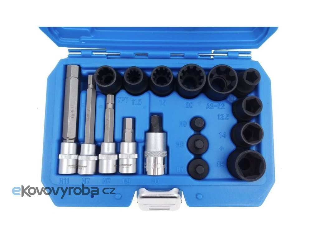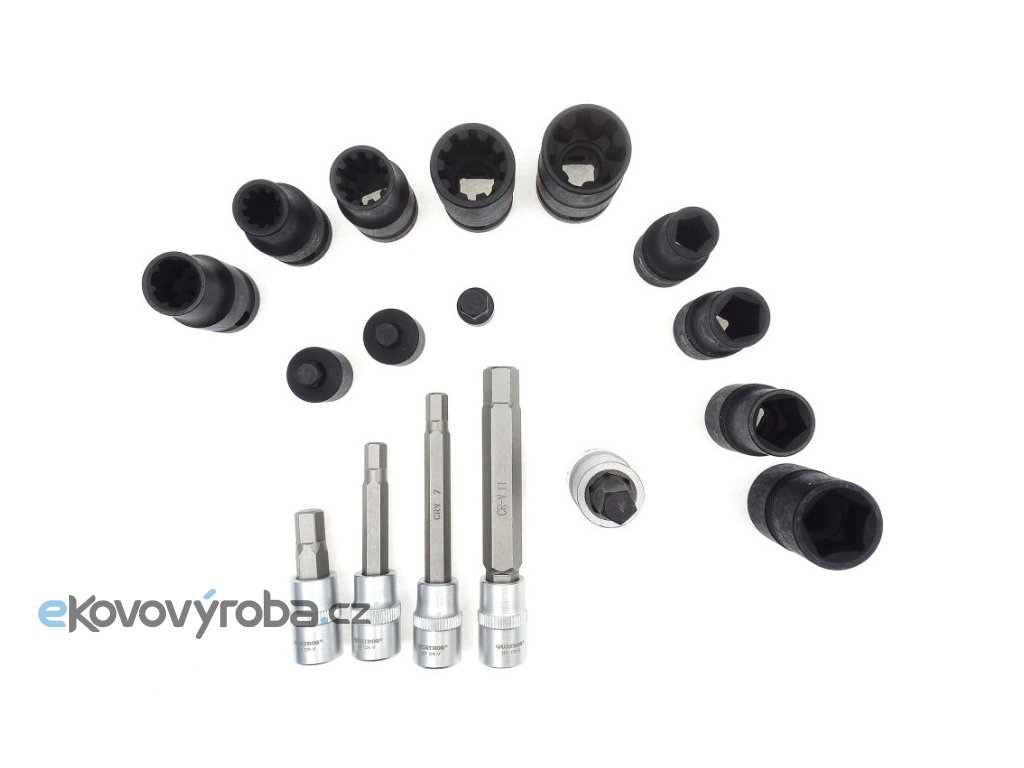 Součástí jsou zástrčné i nástrčné hlavice s různými profily – šestihranné, pětihranné, sedmihranné i desetibodové, včetně prodloužených variant.
