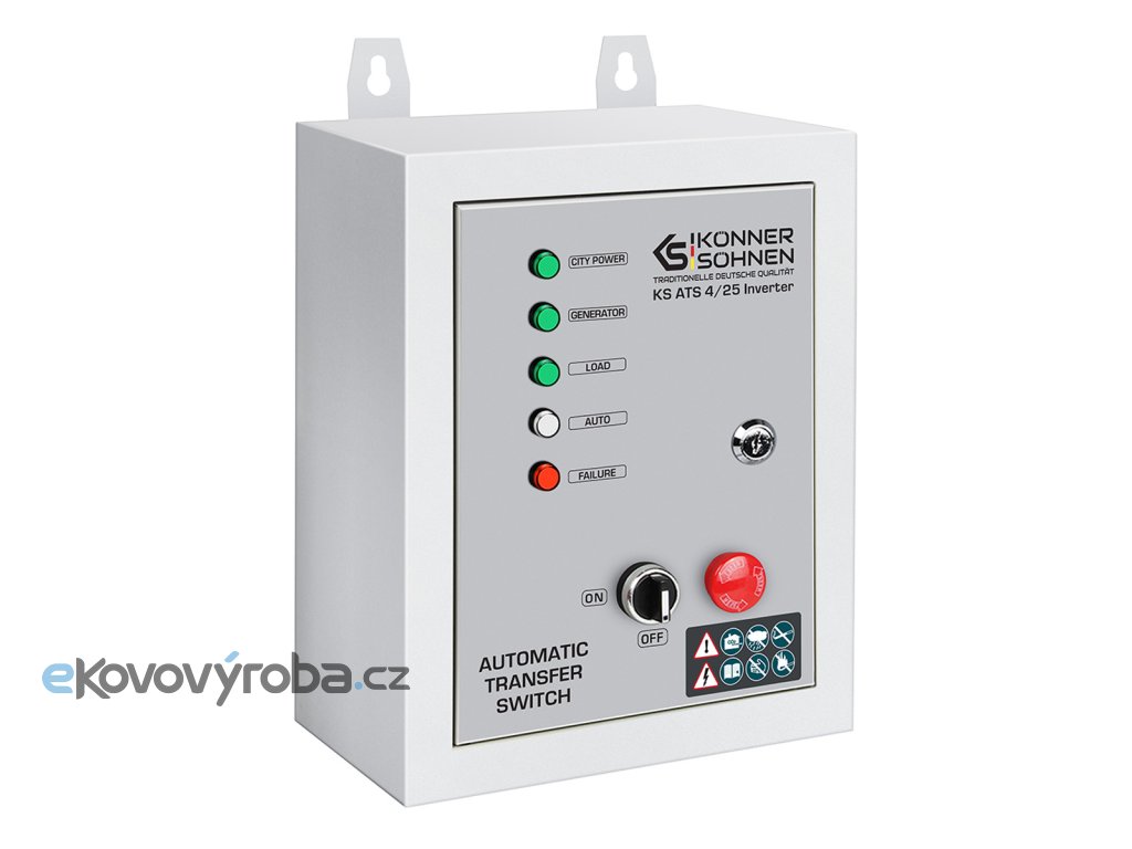 Automatický přepínač KS ATS 4/25 Inverter (jednotka ATS) německé značky „Könner und Söhnen“ automaticky spustí generátor při výpadku primárního napájení a po jeho obnovení jej zastaví. Je kompatibilní s invertorovým generátorem „Könner & Söhnen“ KS 5500iES ATSR s vestavěnou 7kolíkovou připojovací zásuvkou ATS.
