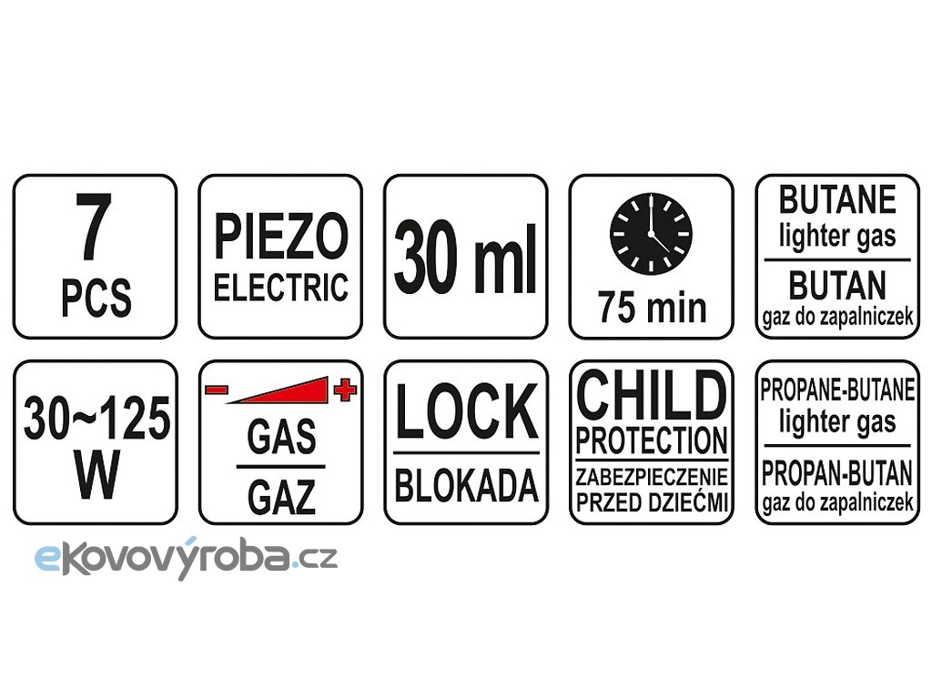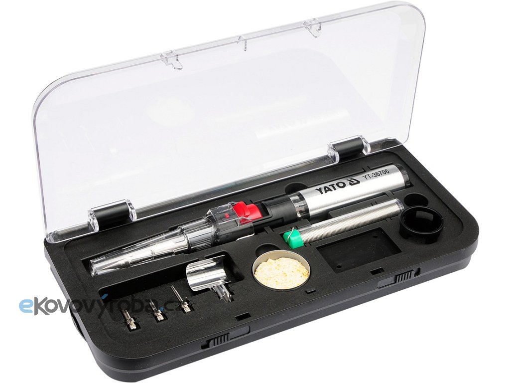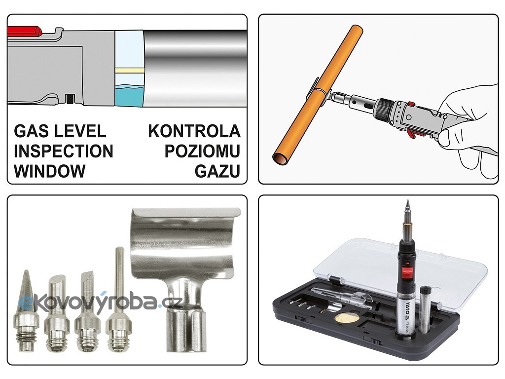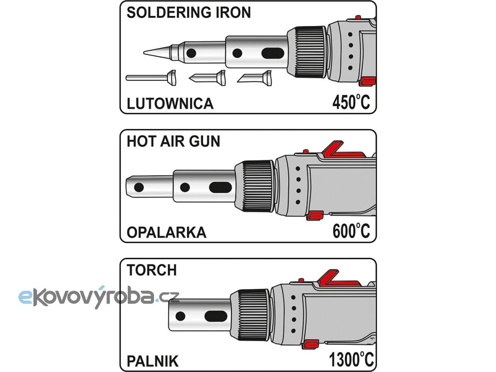 Pájka dále nabízí plynulé nastavení velikosti plamene, plynovou spoušť a rozkládací stojan a dlaší pájecí příslušenství.