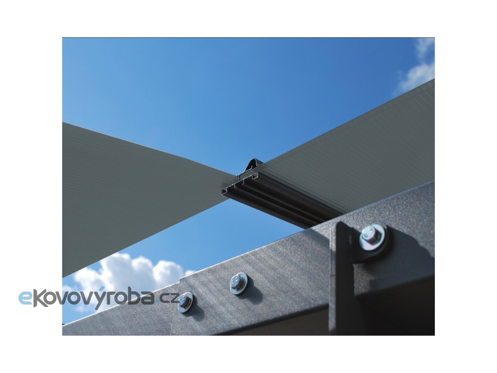 Střešní panely odolné vůči vysokému zatížení i kroupám, polykarbonát v bronzové barvě. Unikátní systém nasunutí střešních panelů bez dalšího spojovacího materiálu – dokonalá těsnost, jednoduchá montáž a netečnost k teplotní roztažnosti panelů. Hliníkový rám s galvanicky ošetřenými kovovými prvky je ošetřen antracitovou práškovou barvou a je vysoce odolný vůči rezavění.