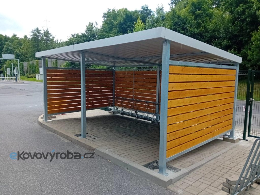 Konstrukce je svařená z jeklů a je žárově pozinkovaná. Na střeše je pozinkovaný a lakovaný trapézový plech Satjam. Opláštění je z dřevěných prken natřených olejovou lazurou. Mezi prkny je mezera 2-3 cm. Stojany na kola jsou připevněny k zadní stěně přístřešku. Rozměry přístřešku jsou 5000 × 3000 × 2000 mm. Cena montáže dle místa určení.
