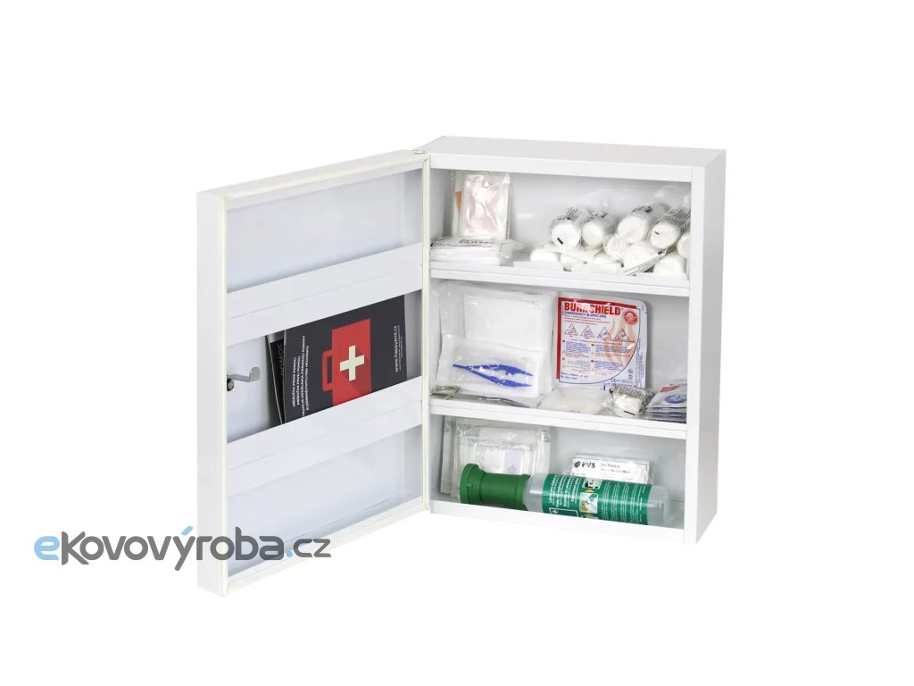 Nástěnná lékárnička je vyrobena z odolné oceli ošetřené práškovou barvou pro uskladnění zdravotnických prostředků první pomoci. Lékárnička je vybavena dvěma pevnými poličkami a dvěma pevnými přihrádkami. Dveře jsou vybaveny těsněním, které chrání obsah lékárničky před prachem a vlhkostí, je proto vhodná i do prašného prostředí. Lékárnička je vybavena cylindrickým zámkem a dvěma klíči pro možnost uzamčení. Tuto schránku lze zavěsit na zeď tak, aby se dvířka otevírala doprava nebo doleva. |