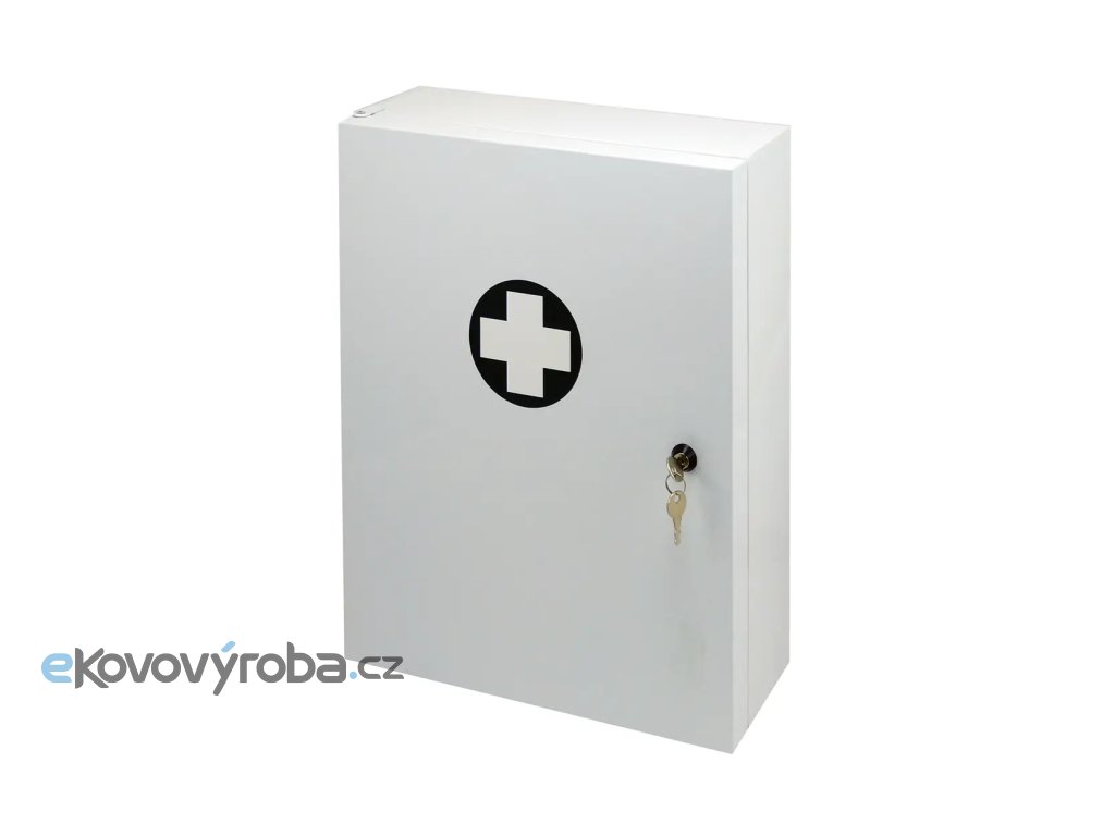 Nástěnná lékárnička je vyrobena z odolné oceli ošetřené práškovou barvou pro uskladnění zdravotnických prostředků první pomoci. Lékárnička je vybavena dvěma pevnými poličkami a dvěma pevnými přihrádkami. Dveře jsou vybaveny těsněním, které chrání obsah lékárničky před prachem a vlhkostí, je proto vhodná i do prašného prostředí. Lékárnička je vybavena cylindrickým zámkem a dvěma klíči pro možnost uzamčení. Tuto schránku lze zavěsit na zeď tak, aby se dvířka otevírala doprava nebo doleva. |