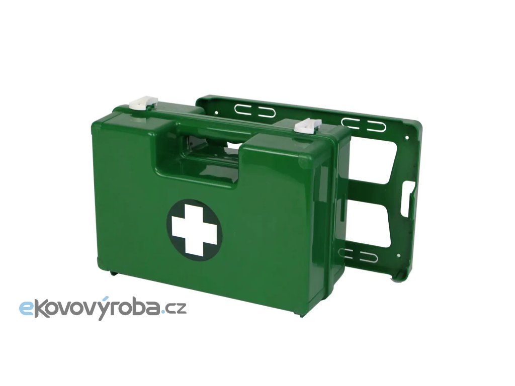 Pevný nárazuvzdorný kufřík má vnitřní prostor dělený vyjímatelnými přepážkami a chráněný průhlednými víky. Kufřík je doplněn stěnovým držákem, který umožňuje jednoduché zavěšení na zeď. V případě potřeby lze kufřík sejmout a odnést na místo potřeby. Kufřík je navíc vybaven zajišťovacím kolíkem, který umožňuje nechat kufřík otevřený v držáku na stěně v úhlu 90°. Bezpečné zavírání kufru zajišťují dva otočné uzávěry. Součástí balení je samolepka kříž, kterou je nutné si na kufřík nalepit. |