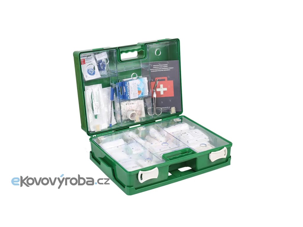 Pevný nárazuvzdorný kufr pro uložení vybavení první pomoci. Obsah kufru je možné uložit do dvou oddělených částí. Obě části kufru jsou vybaveny průhlednými plexiskly, která umožňují přehledné uložení zdravotnického vybavení a zároveň ho chrání. Víko kufru je vybaveno neoprenovým těsněním, které chrání před prachem a vlhkostí, je proto vhodný i do prašných provozů. Kufr je doplněn nástěnným držákem s montážním materiálem, který umožňuje jednoduché zavěšení na zeď. V případě potřeby lze kufr sejmout a odnést na místo potřeby. Bezpečné zavírání zajišťují dva otočné uzávěry. |