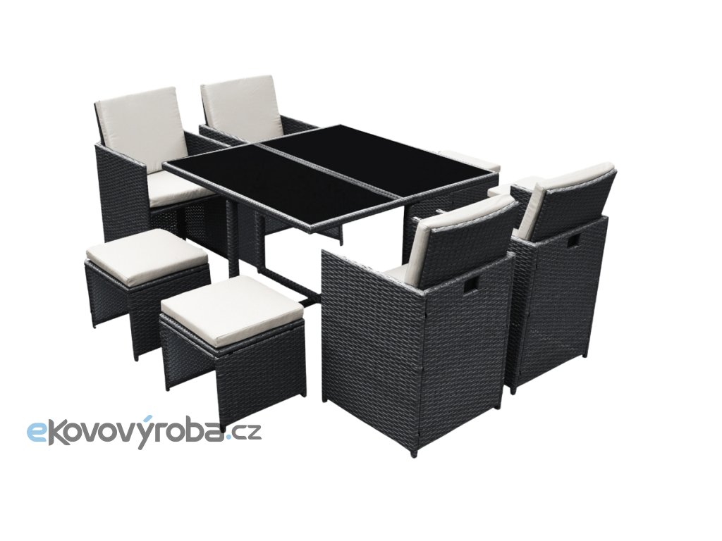 Univerzální zahradní nábytek v elegantním hnědém ratanu, ideální pro venkovní odpočinek na vaší zahradě, balkóně nebo terase. Obsahuje čtyři křesla, čtyři taburety a stůl.
