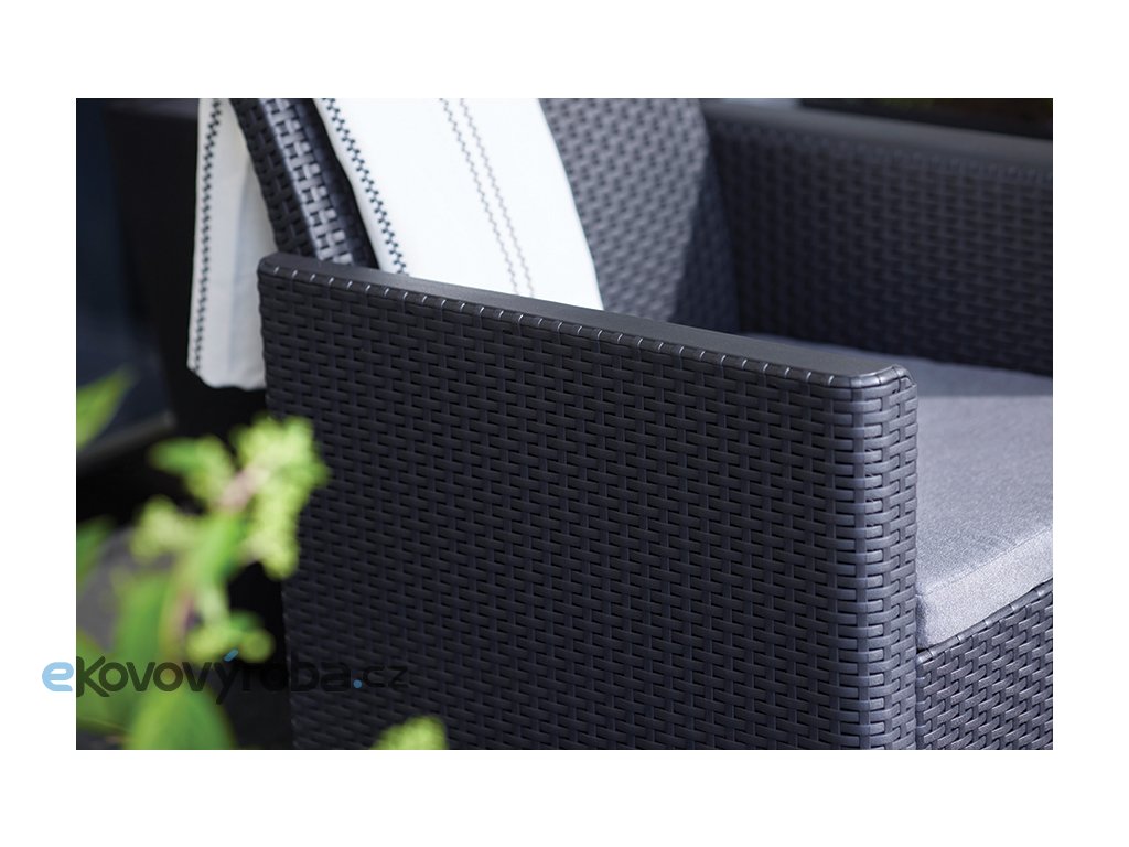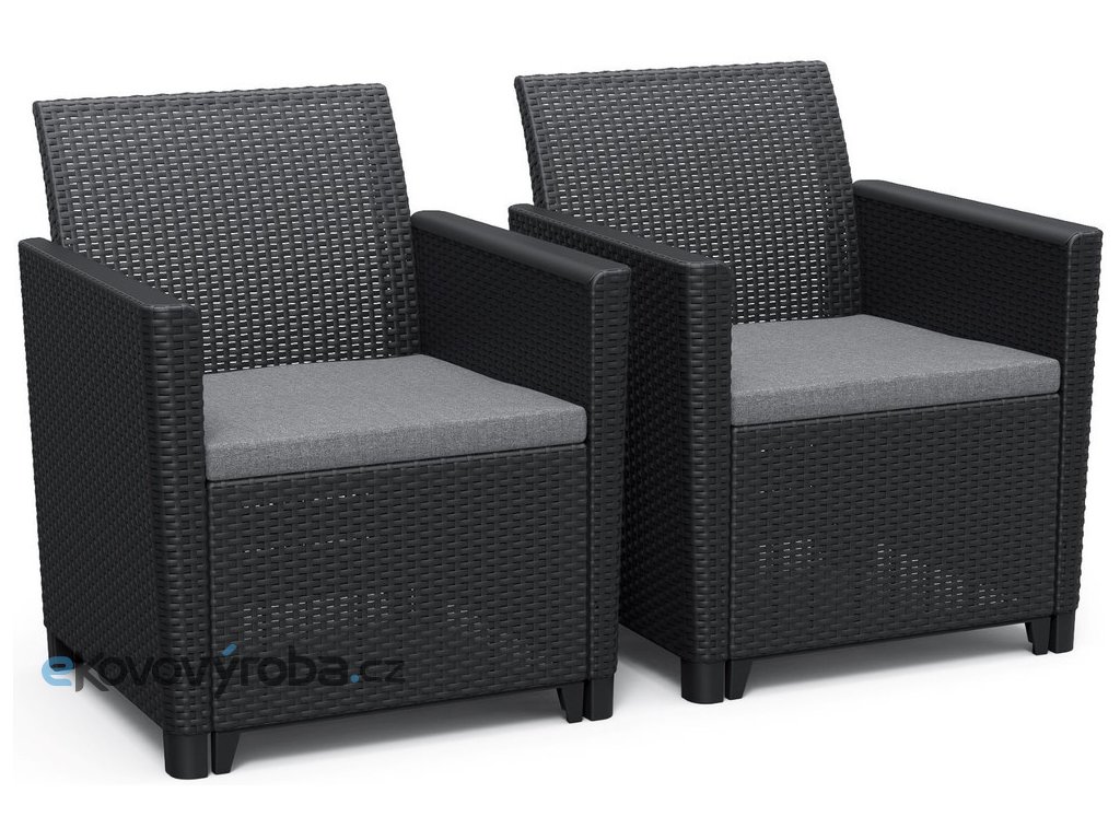 Souprava je vyrobena z lisovaného plastu v imitaci přírodního ratanu. Proměňte svou terasu, balkon nebo dvorek s křeslem Claire. Podušky, které jsou součástí setu, poskytují právě ten extra kousek pohodlí během Vašich odpočinkových chvil. Set je velmi snadný na údržbu. Výrobek je vysoce odolný proti UV paprskům a povětrnostním vlivům.