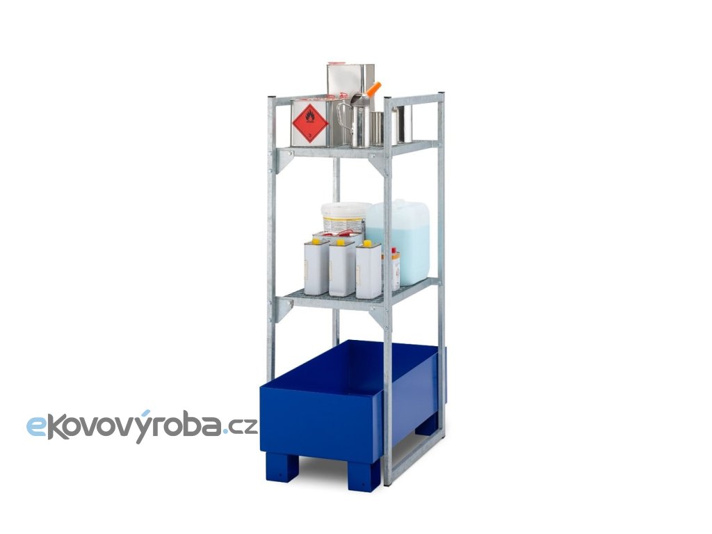 Kovový pozinkovaný regál se dvěma policovými rošty na uložení drobného materiálu a menších nádob. Součástí regálu je kovová záchytná vana. Rozměr 45x82x131 cm, výška první úrovně 60 cm, výška druhé úrovně 112 cm