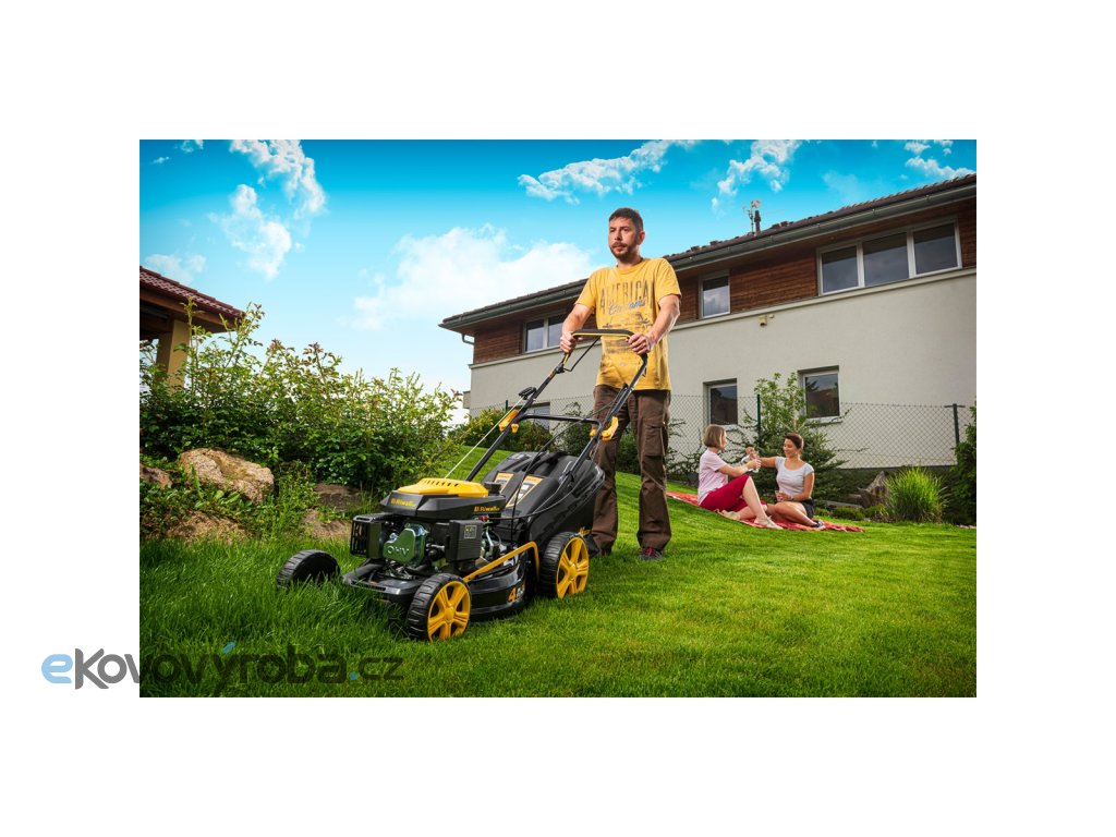Spolehlivý střih trávy obstarává široký tvarovaný žací nůž se záběrem 46 cm. Sekačka podporuje systém 4v1. Máte tedy možnost využít funkce: bočního výhozu, zadního výhozu, mulčování nebo sběru do 50 litrového koše. Samotný sběrný koš ve vrchní části je opatřen odvodem vzduchu do stran, což ocení především lidé trpící alergií.