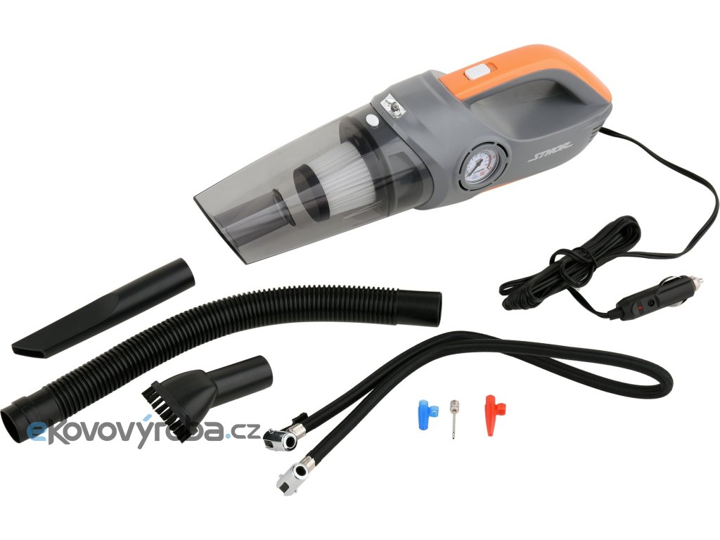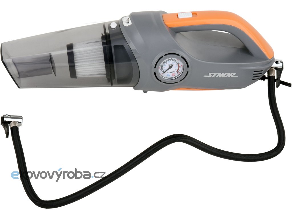 Přenosný vysavač s funkcí kompresoru, s dlouhým kabelem se zástrčkou do zásuvky automobilového zapalovače 12V.