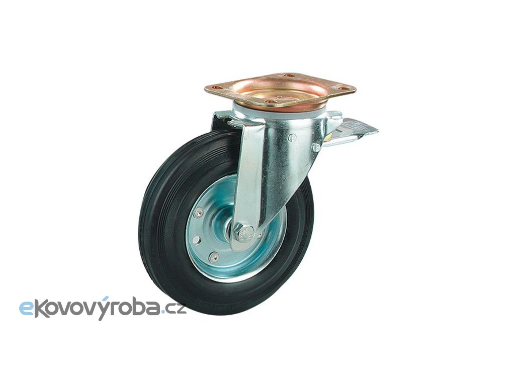 Vyrobeno z ocelového pozinkovaného výlisku – vidlice. Kolečko vyrobeno z pryže. Zpevněná ocelová vidlice v zinkované povrchové úpravě. Široké uplatnění kol ve výrobních závodech – přepravní vozíky, mobilní stolky, dále ve stavebnictví pro lešení apod. V souladu s normou EN 12532 – Kladky a kola pro rychlost do 4 km/h. 200 mm 50 mm 205 kg 240 mm 105x80 mm 137x105 mm 11 mm