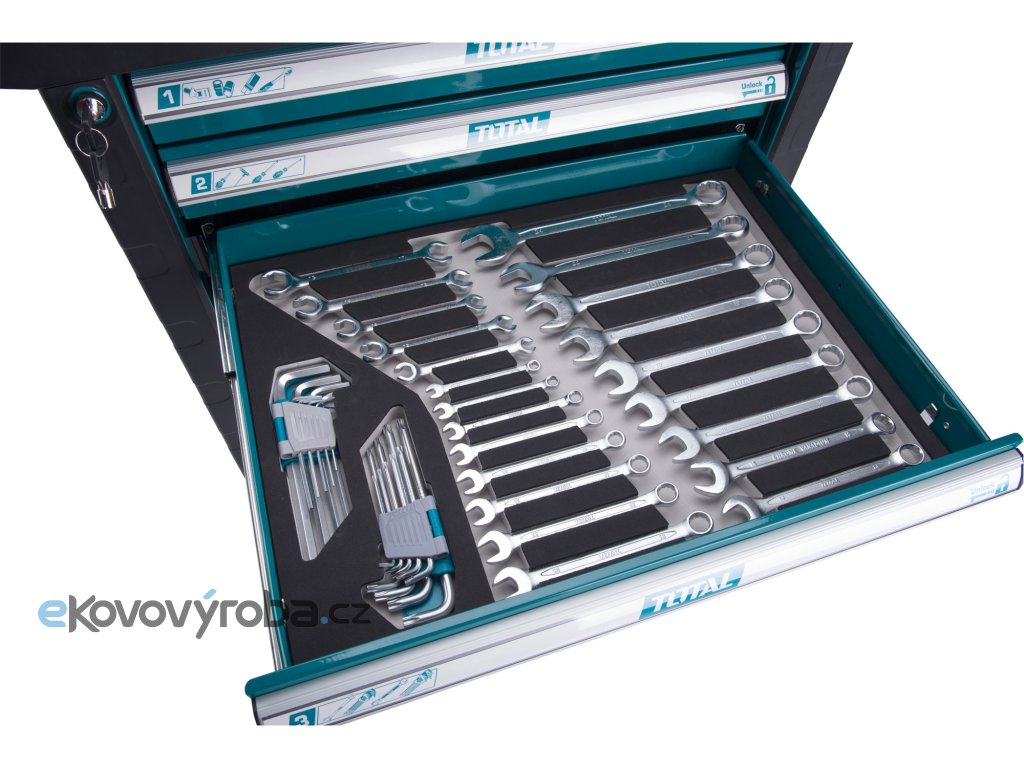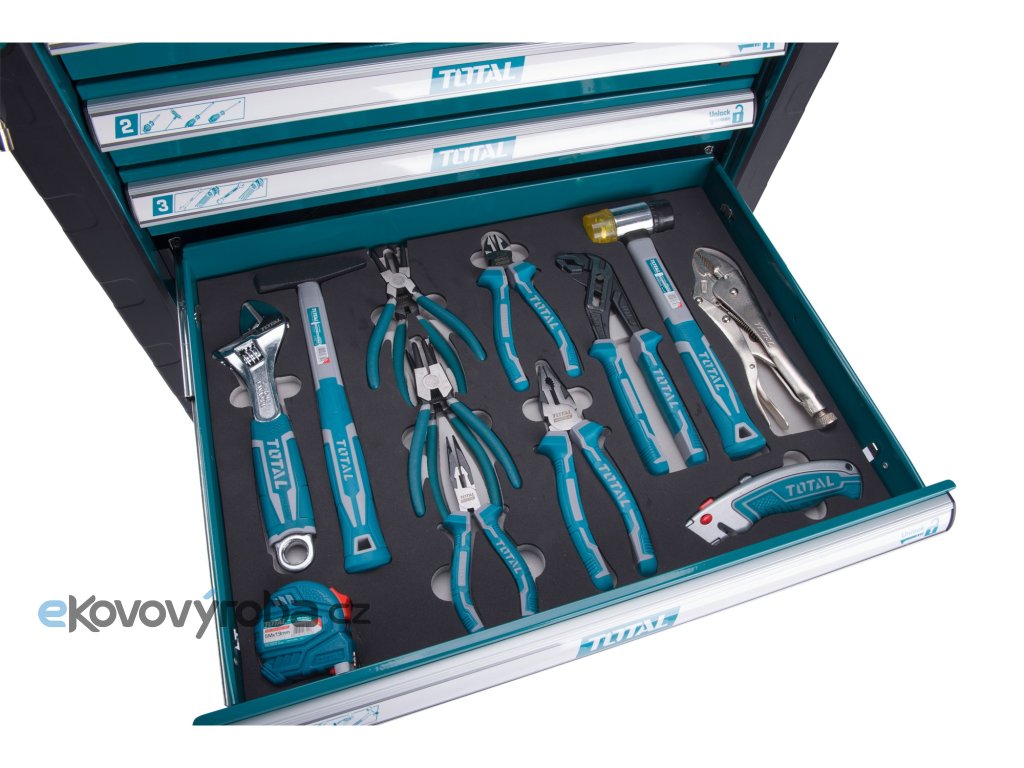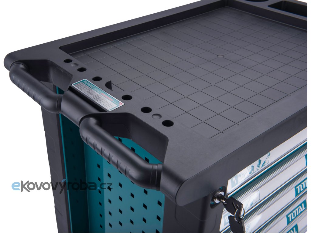 Dílenský vozík obsahuje vysoce kvalitní nářadí z CrV oceli a dalších lepších slitin. Vozík obsahuje 7 šuplíků a má rozměry 765x465x812mm. Rozměry horních 5 šuplíků jsou 536x410x74,5mm. Spodní dva šuplíky jsou hlubší s rozměrem 536x410x153,5mm. Vozík je uzamykatelný jedním klíčem. Je vybaven brzdami na obě dvě zadní transportní kolečka. Pojezdy zásuvek s kulovými ložisky jsou vybaveny zarážkou proti celkovému výsuvu. Pro snadnou manipulaci je vozík nahoře vybaven úchopy pro ruce.