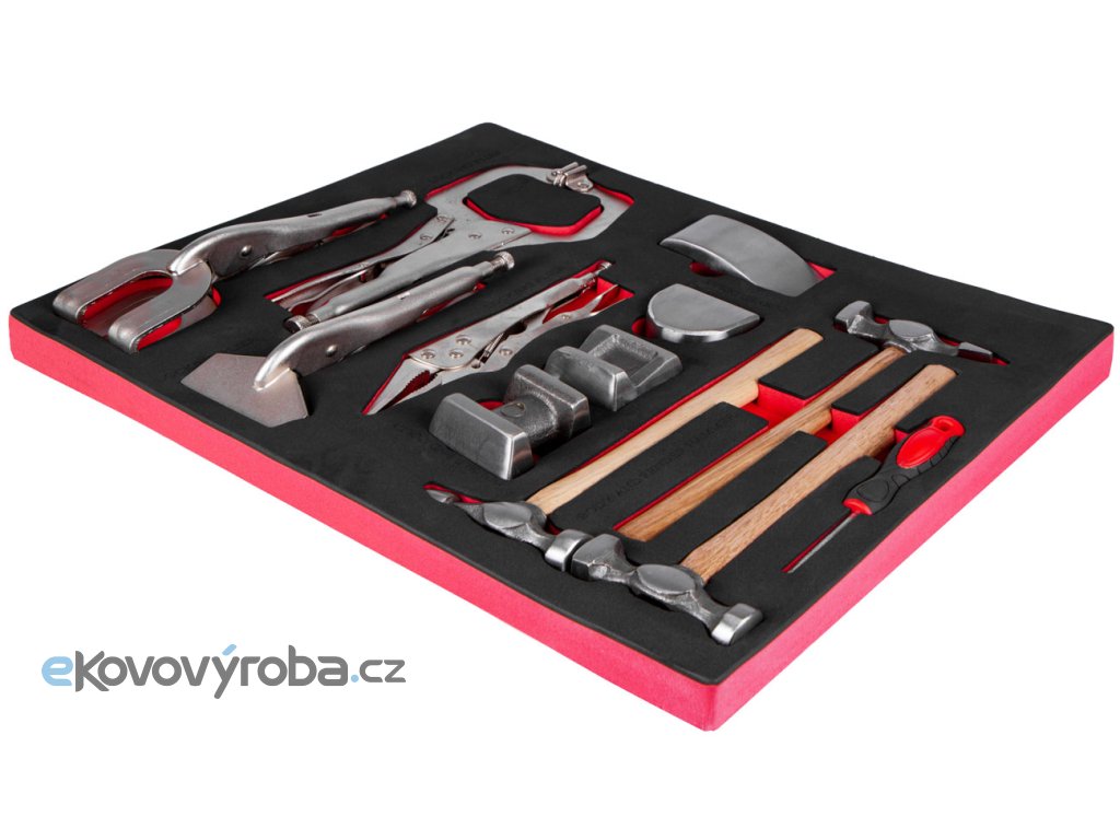 Sada klempířských kladiv, babek a svěrek, vhodná pro opravy karoserií a klempířské práce, uložená v přehledné pěnové výplni.