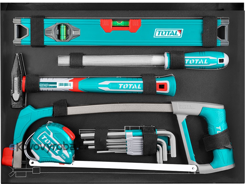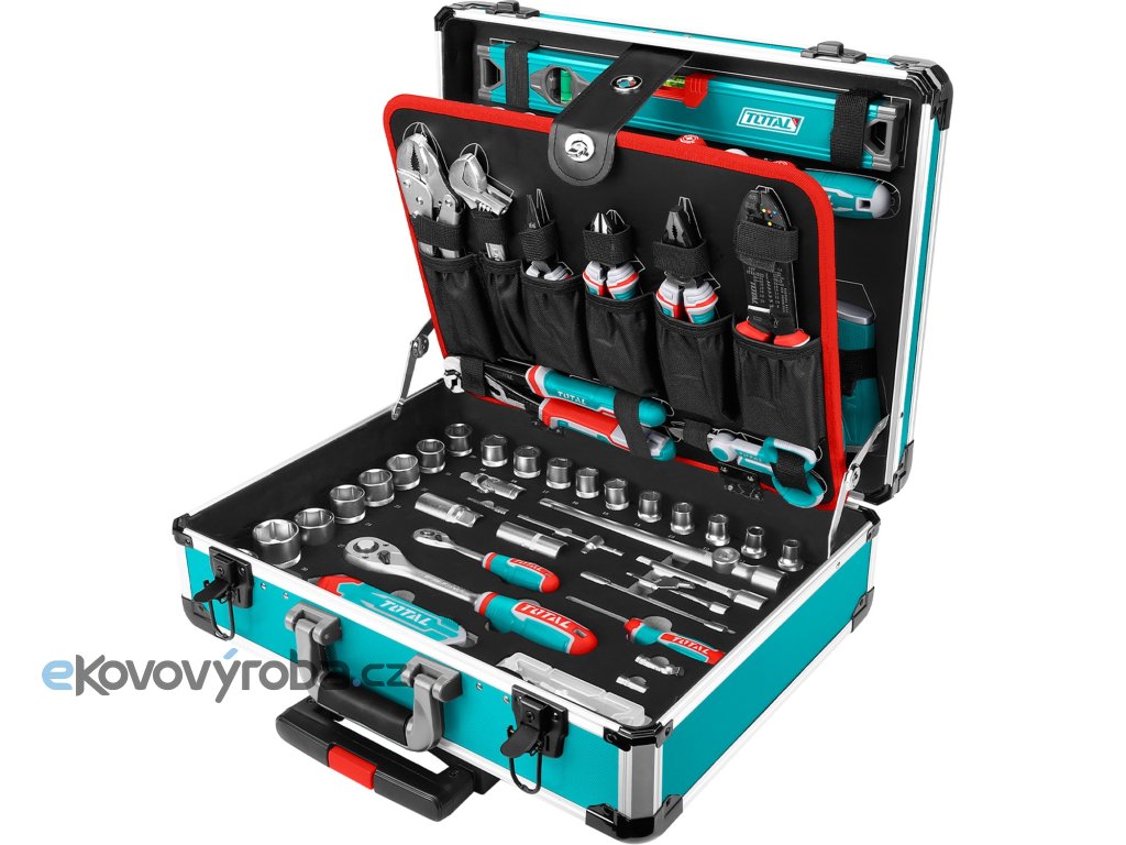 Bohatá sada obsahující nejrůznější ruční nářadí od kleští, přes gola sadu až po vodováhu. Vše uloženo v praktickém kufru s kolečky a výsuvnou rukojetí.