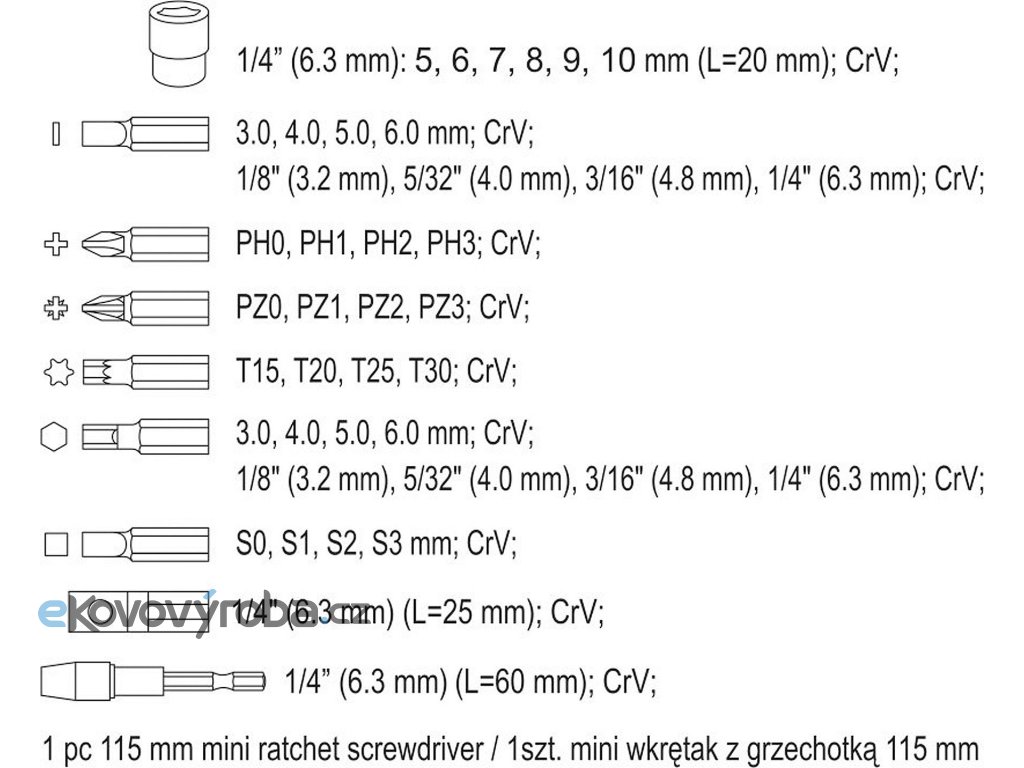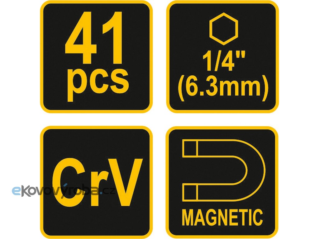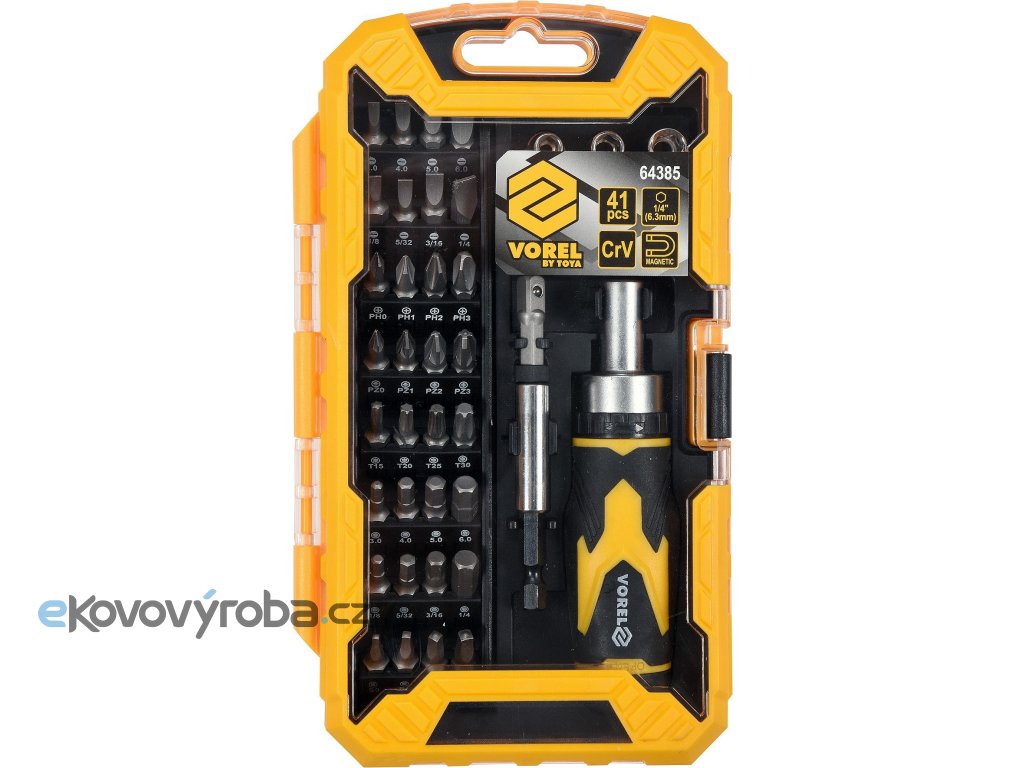 Nářadí je precizně zpracováno z CrV oceli a jednotlivé bity 1/4"(6,3 mm) jsou magnetické, čímž usnadňují práci se součástkami. Bytelné tělo ráčnového šroubováku je duté a po odšroubování zadní části je přístupné např. pro odkládání drobných součástek.