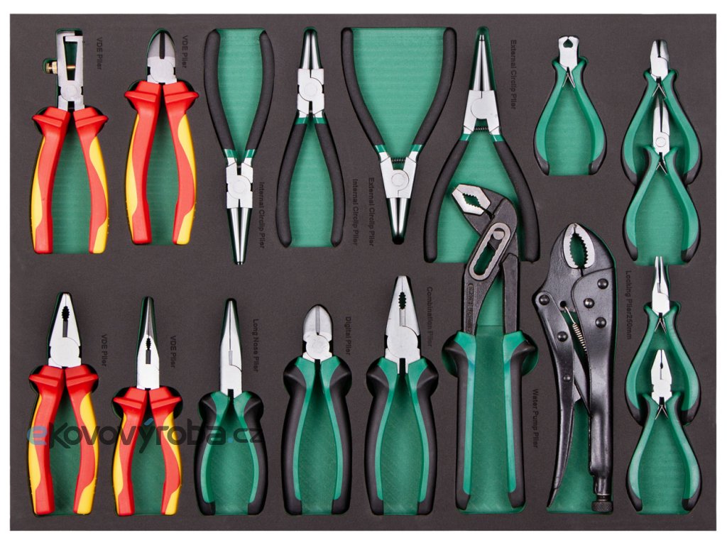 Rozsáhlá sada standardních, mini i VDE kleští pro široké spektrum mechanických, montážních a elektrotechnických prací – přehledně uložená v pěnové výplni pro dílenské vozíky.