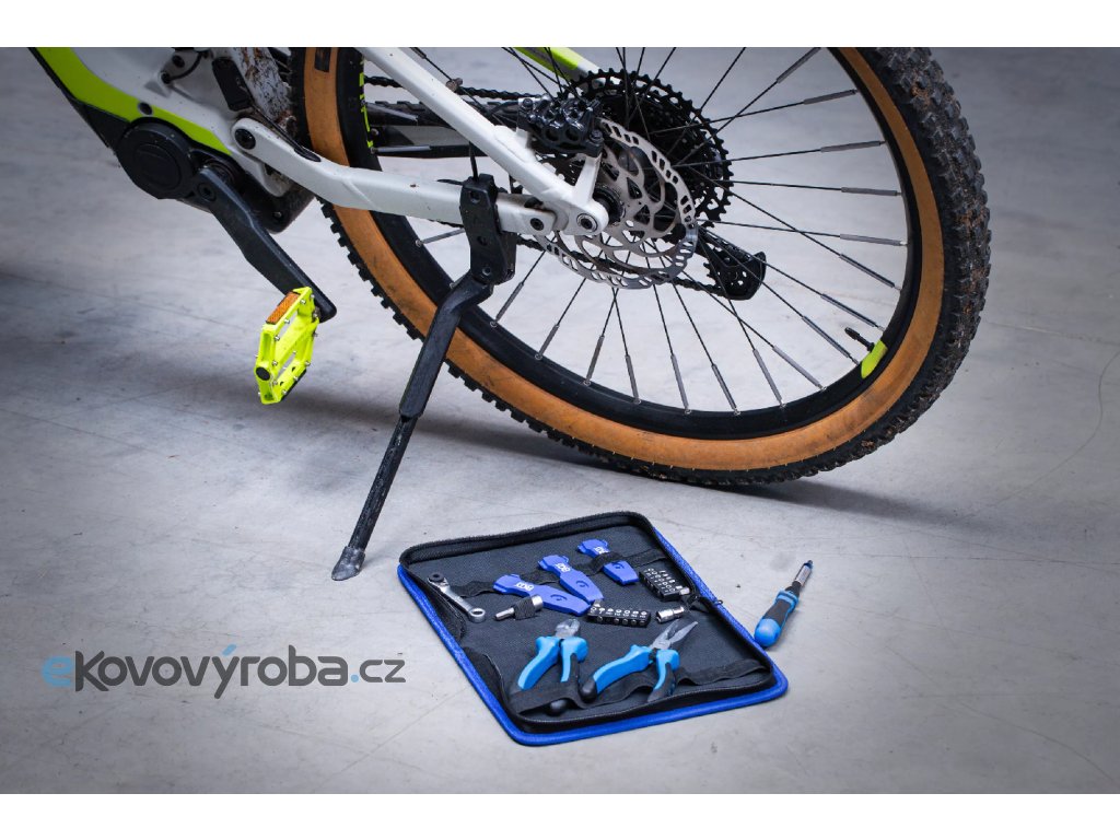 Obsahuje širokou škálu nástrojů včetně speciální bitové ráčny, stavitelného klíče a kleští pro práci s bovdeny.