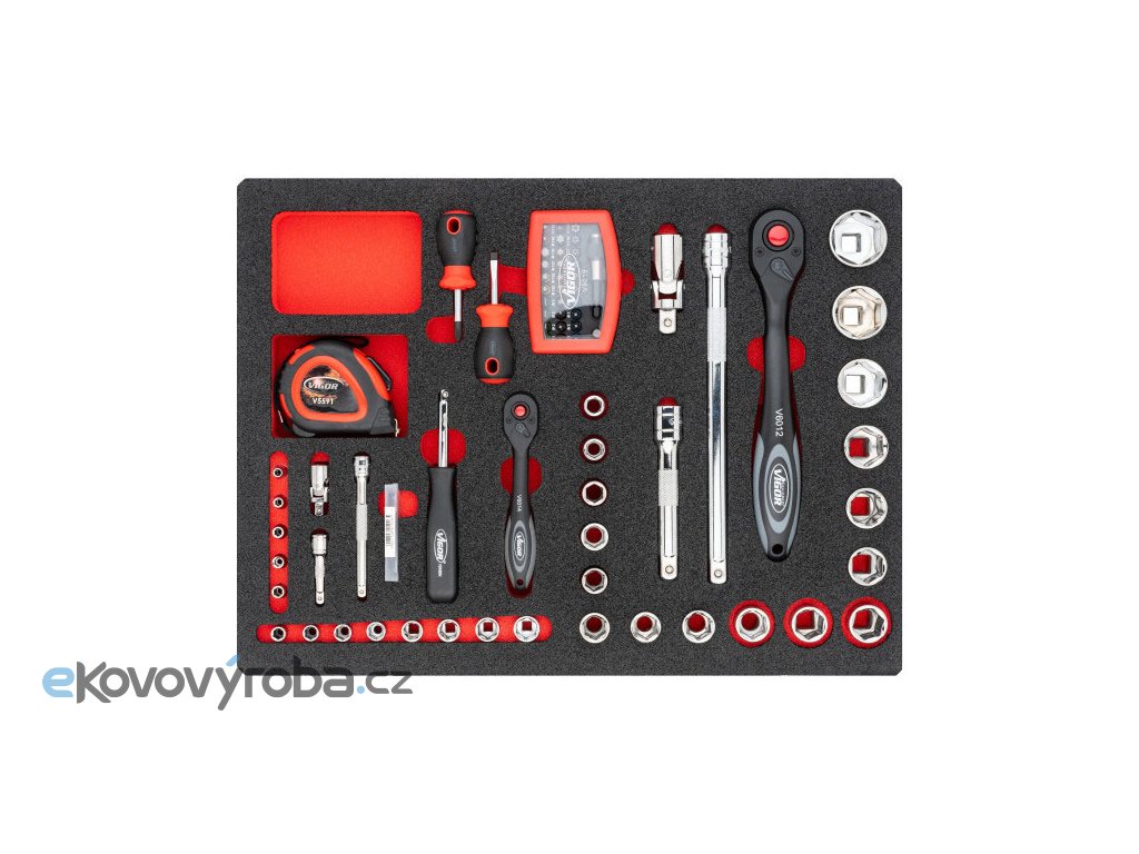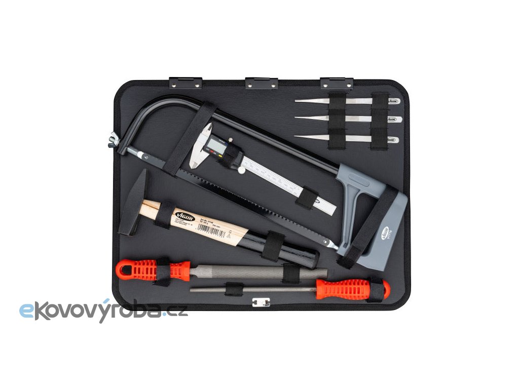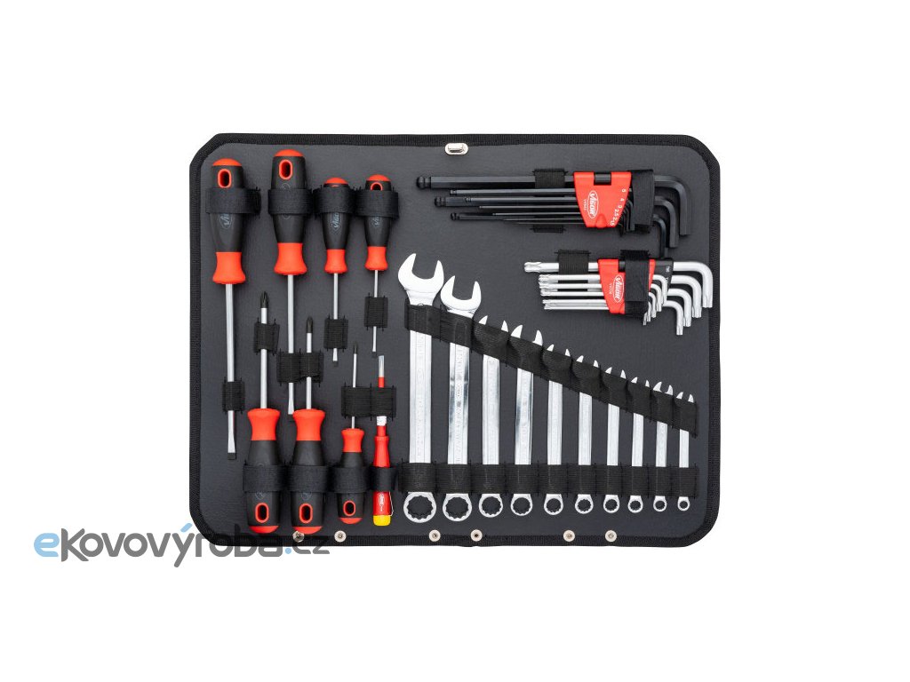 Nářadí je uloženo v pěnových vložkách nebo připevněn popruhy, zůstává tedy přehledně uloženo i při přenášení.