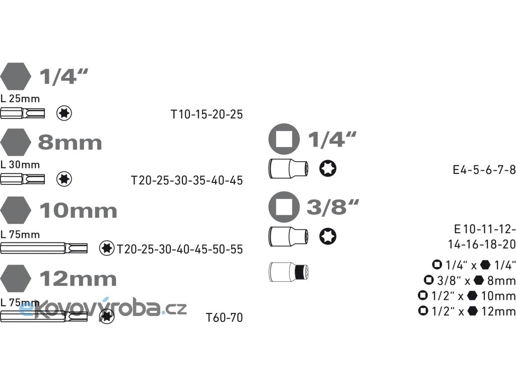 | hlavice nástrčné TORX | 1/4": E4-5-6-7-8, 3/8": E10-11-12-14-16-18-20 |